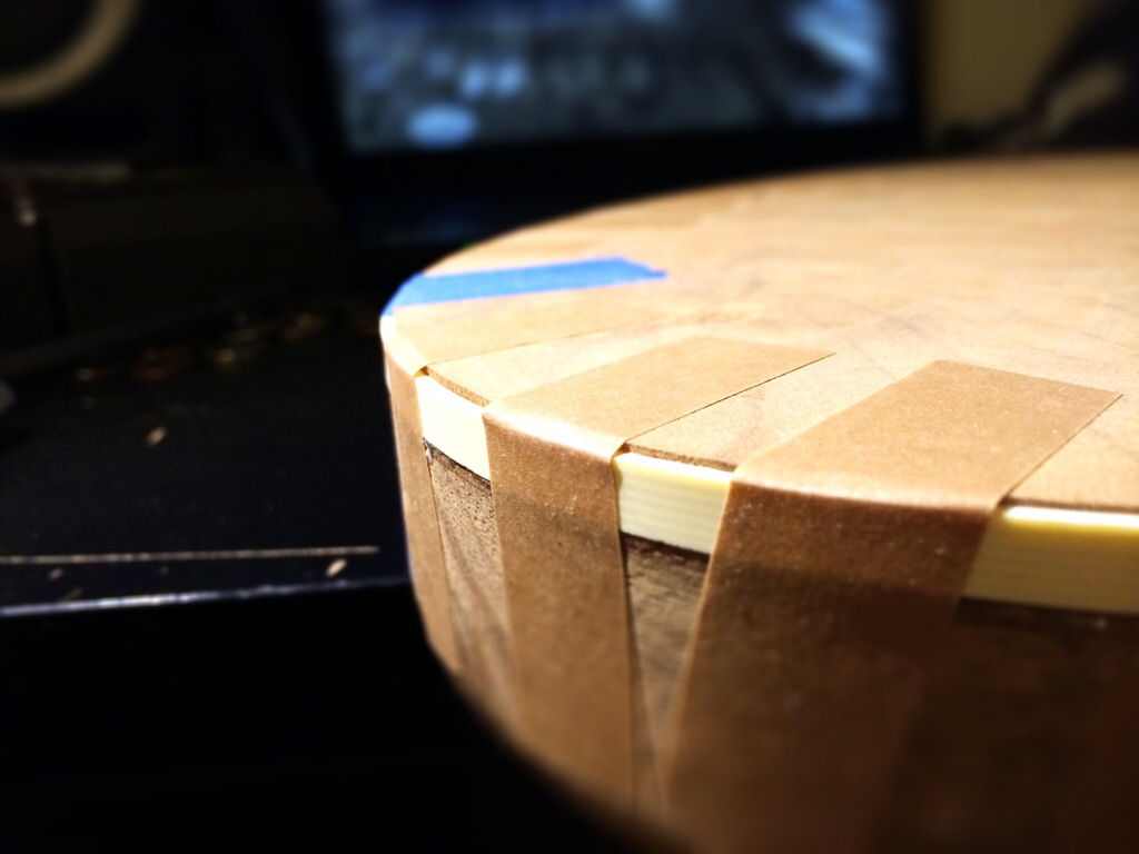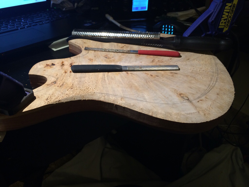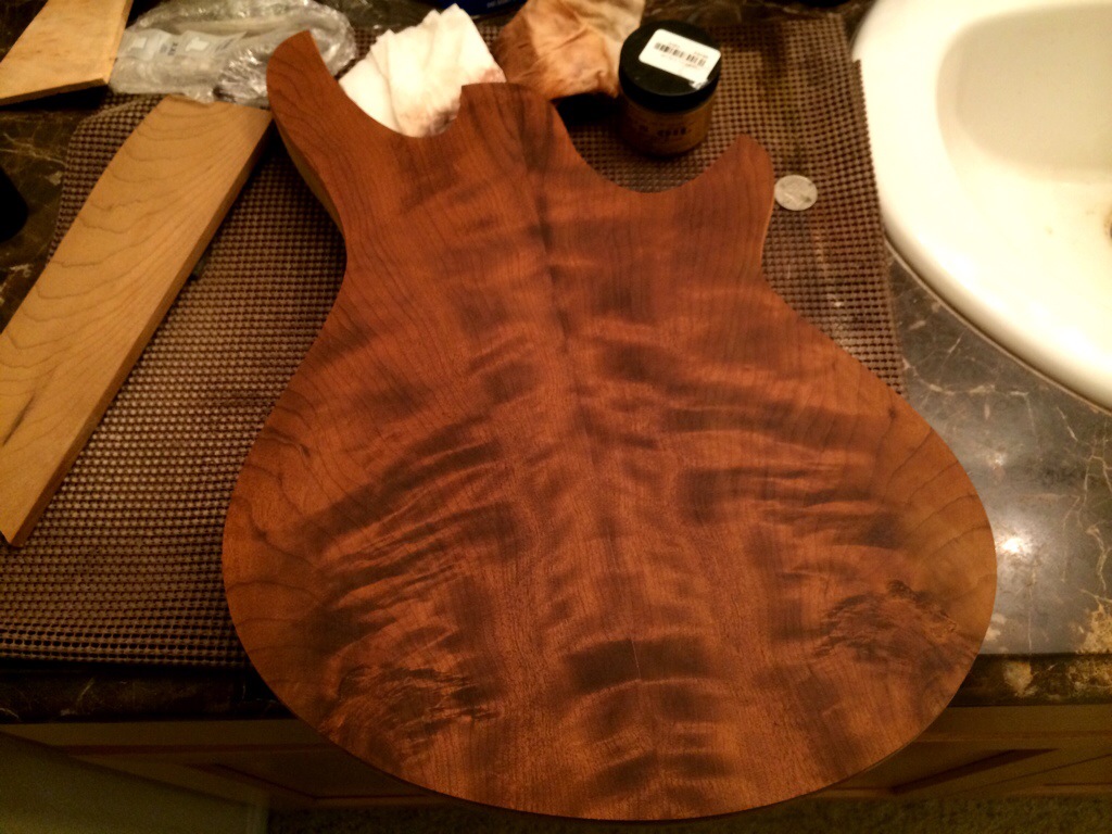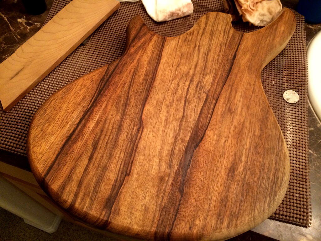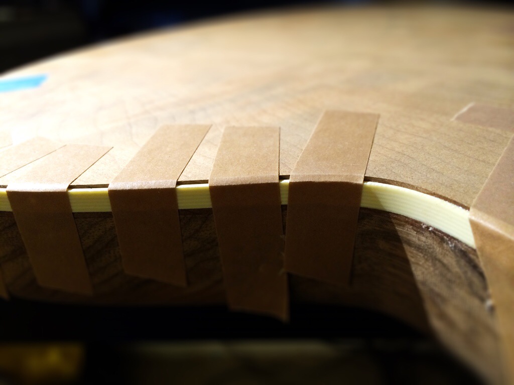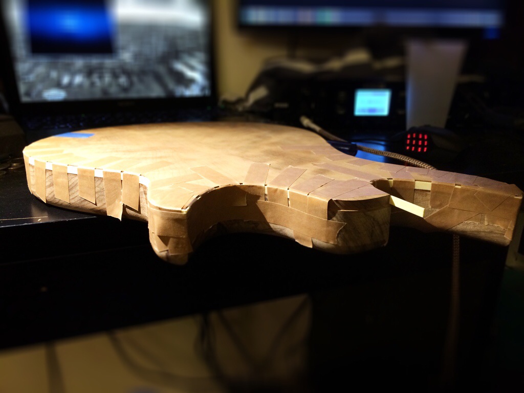 The Imbuya/Korina build is flush routed and rounded. Binding is installed-quite easily I might add- and awaits contouring. Thanks to Aaron Brown of Blackwater Guitars for all the advice and getting me mentally prepared for the binding job. It’s always nice to have someone to look up to. This guitar will receive a fully roasted maple neck.