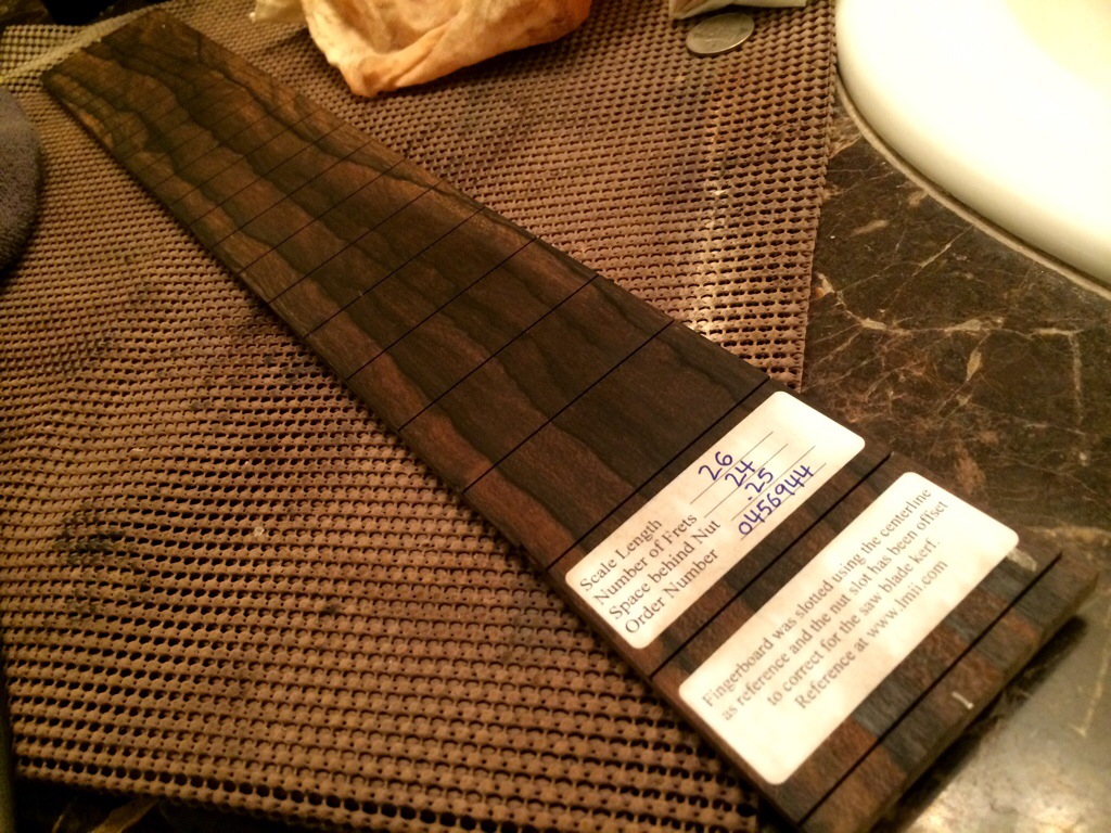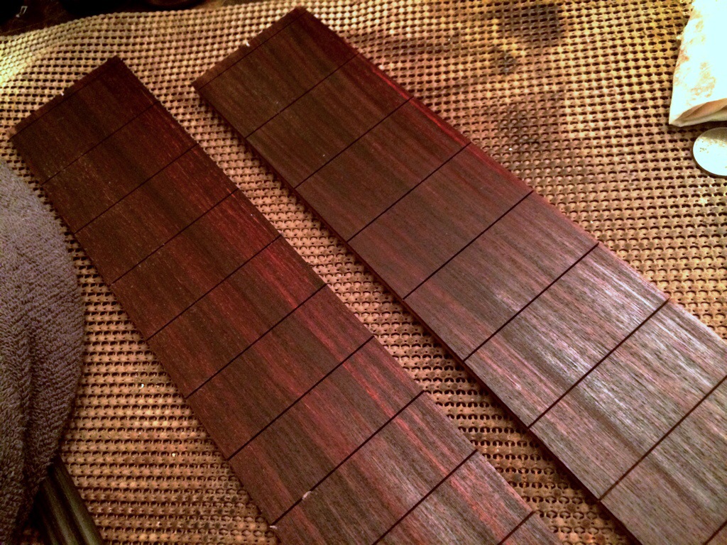 Ganesh’s guitar body has been contoured and awaits neck building to proceed to the next stage. I’ve designed cad fretboard and neck templates for his 28.8 in scale neck. The Indian rosewood fretboards came in for this build and the imbuya and they look glorious.