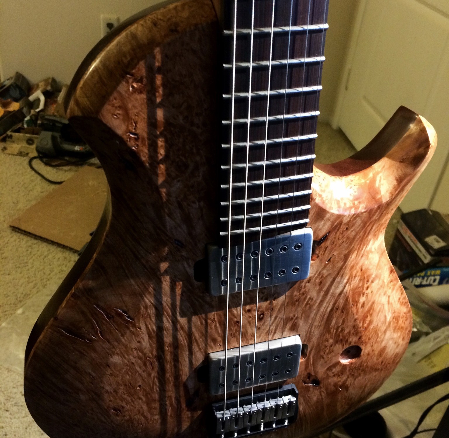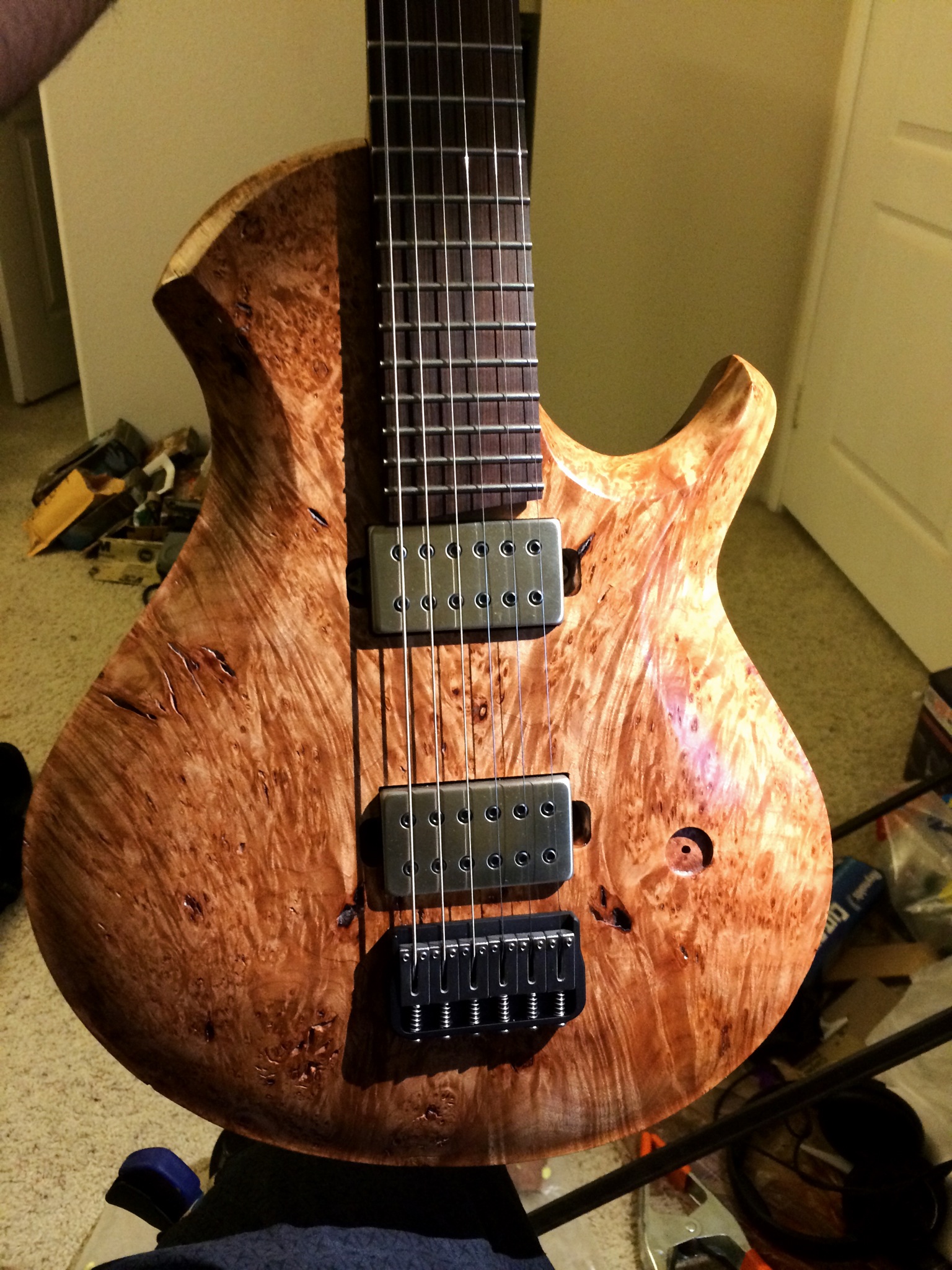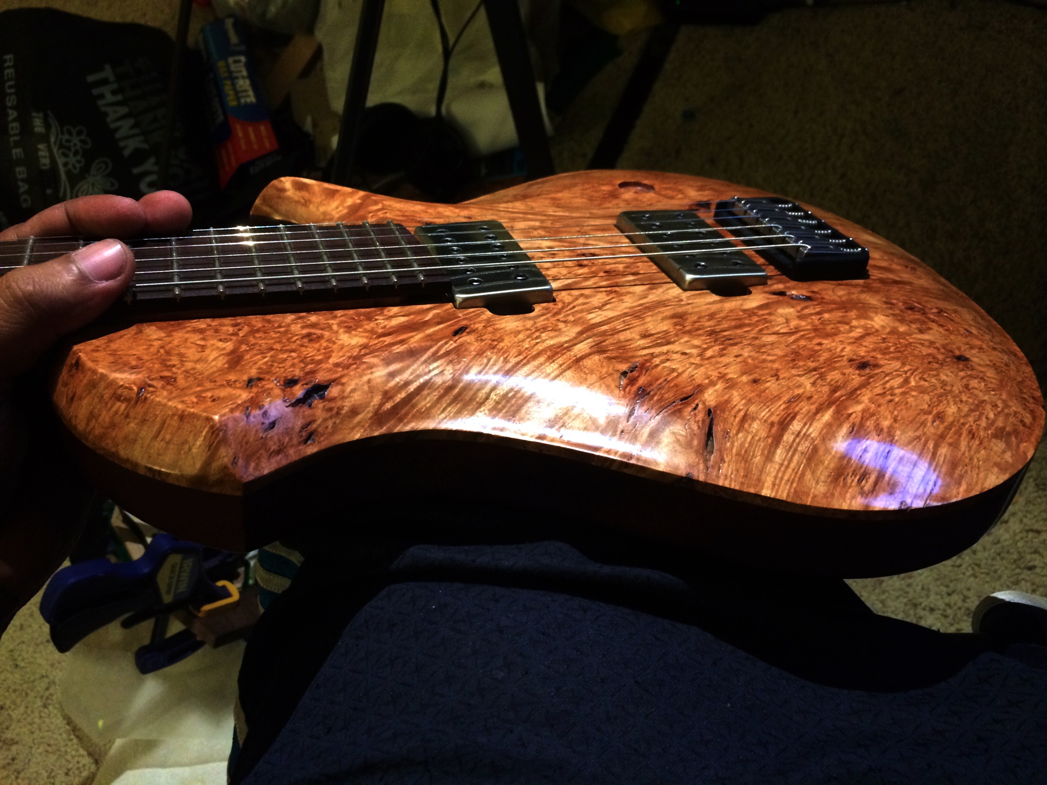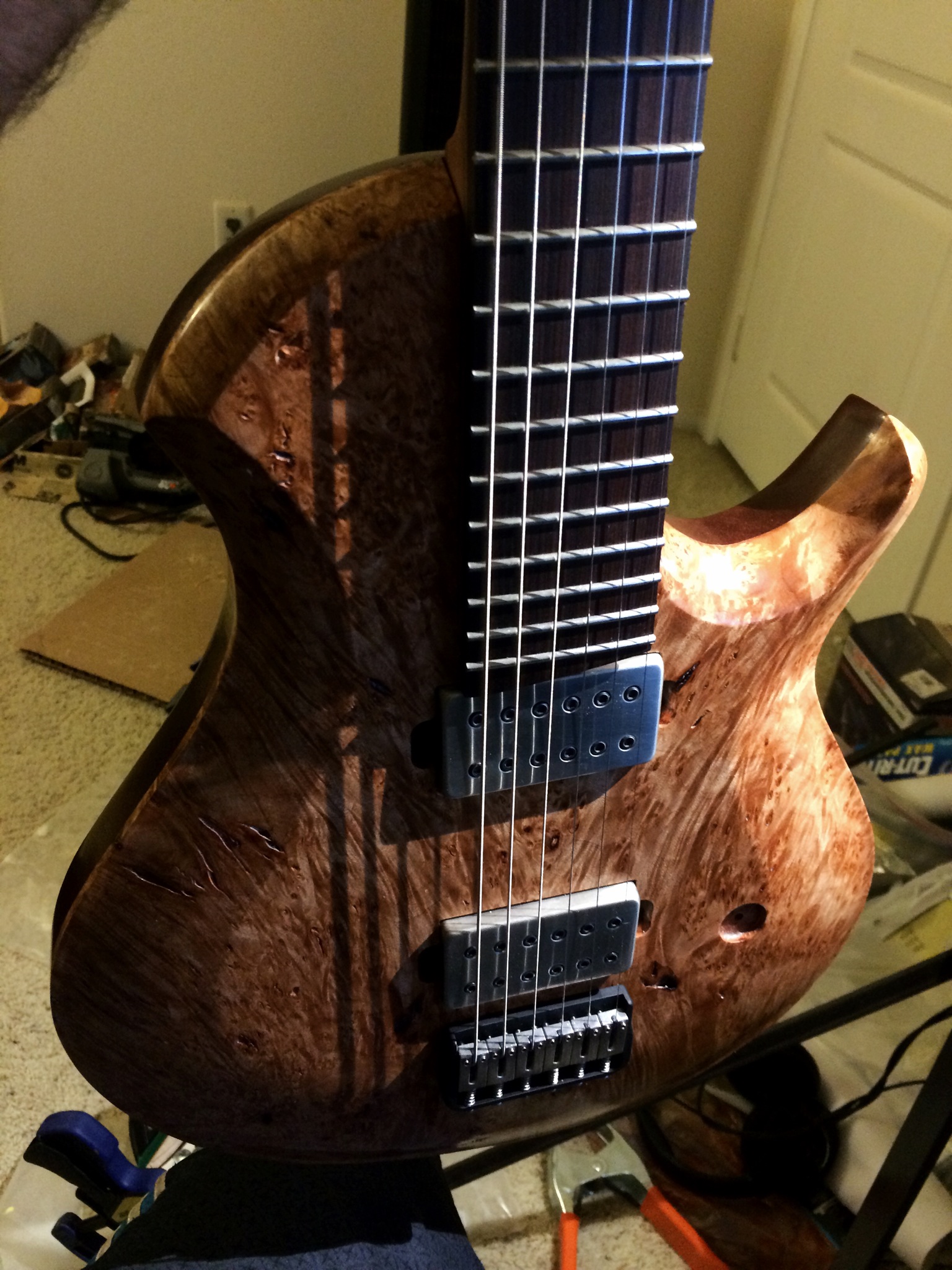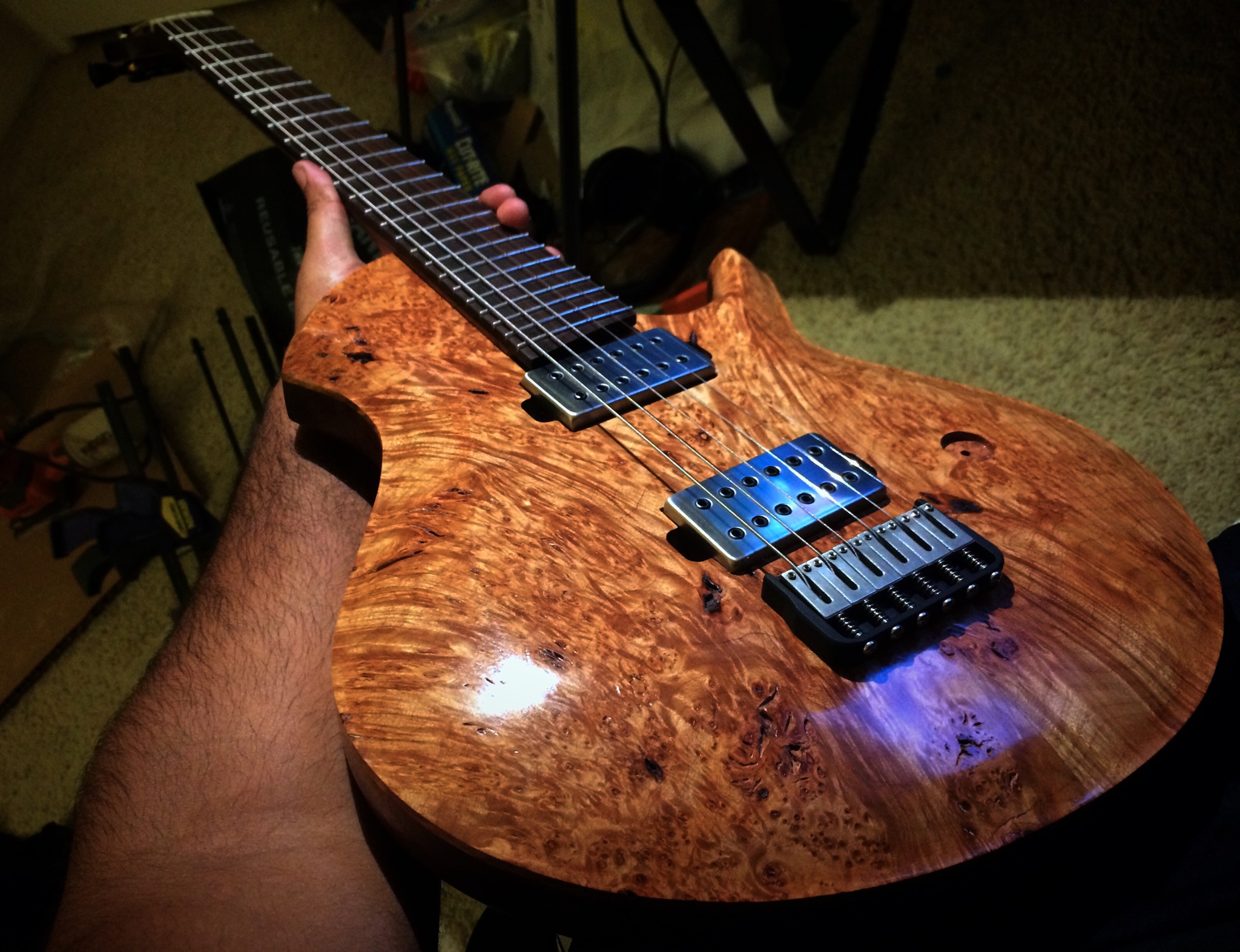 This one I’ve been dragging my feet on but it’s finally finished. It looks pretty great all put together. I can’t wait to hear it all wired up. The acoustic sound that resonates from putting my ear to the body is deep and rich. It’s got a very controlled midrange and an extremely tight low end. The highs are rich and smooth. Hopefully these qualities translate well with he already articulate dimarzio titan bridge and gravity storm neck.