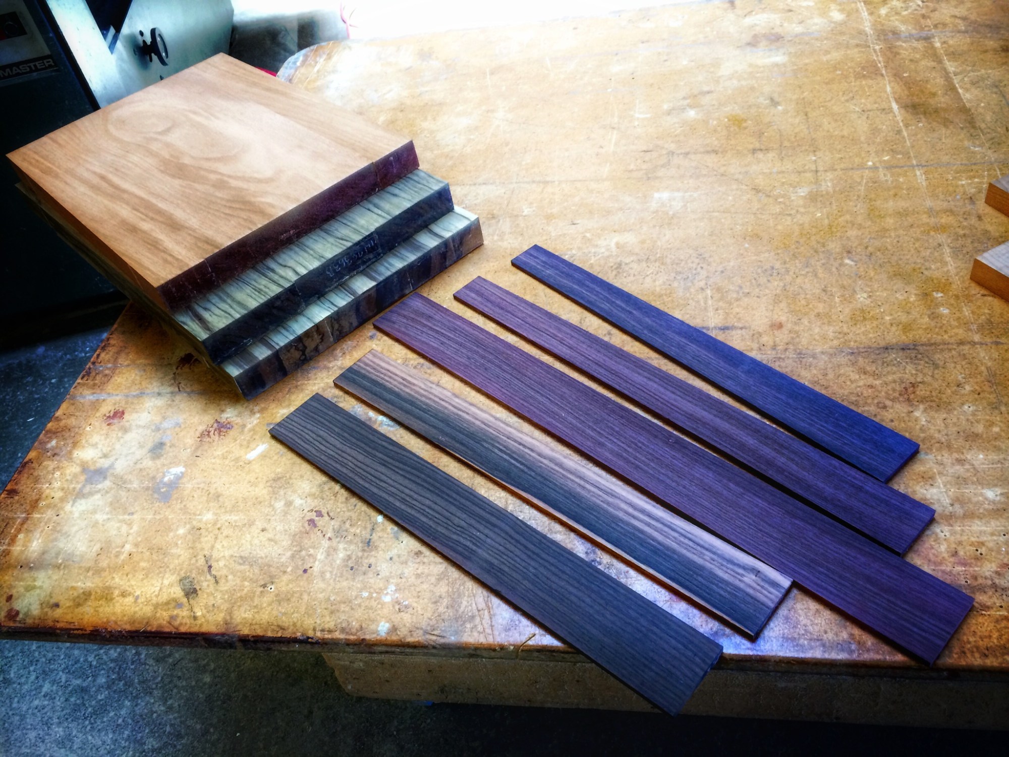 My commissions have been put on hold until now. Everywhere I looked, no one wanted to help me get these Fingerboards to size, even if they had old sanding belts. Finally I’ve thicknesses them down to their ideal size. These are just the right thickness to make a very slim profiles neck. Rudy, owner of reta’s cabinets in Santa Ana, is the man to thank. Actually Francisco was the gentleman who helped me out personally. I really need to invest in a long box planing jig. I just abhor jig making. Anyways the other bodies are thicknesses as well and the two Limba and the Honduran bodies have such a beautiful tap tone. They sing as you’re handling them even– kinda like musical blocks. I have some plans for these. They will make some of the best guitars I’ve done so far, I just know it.