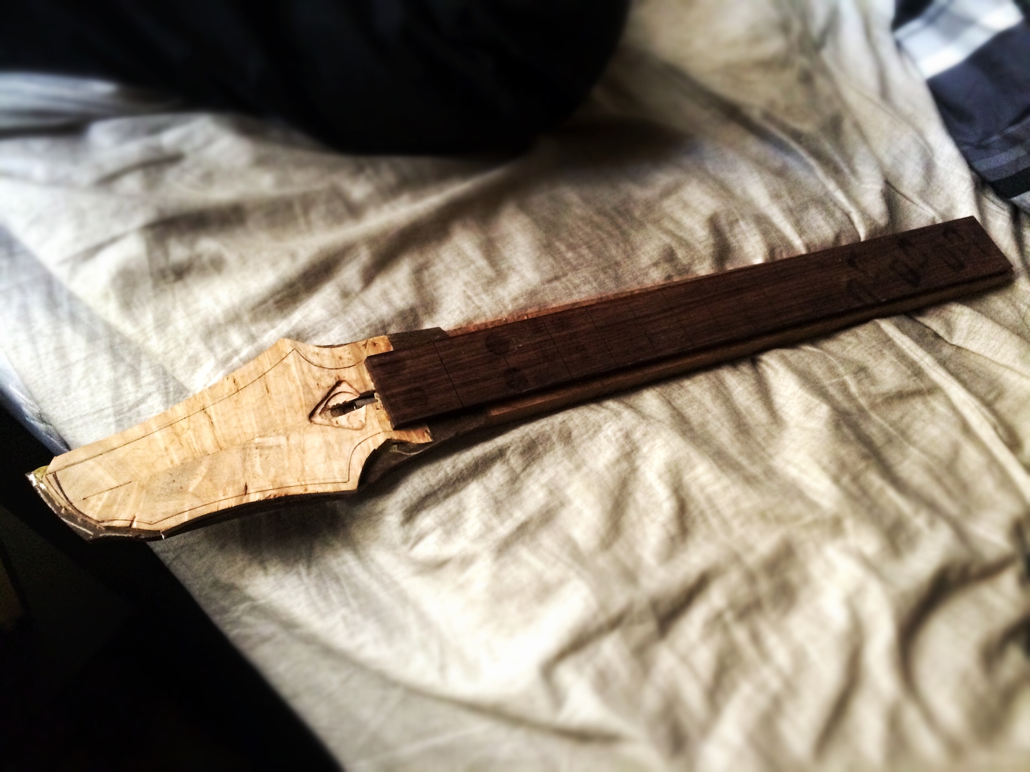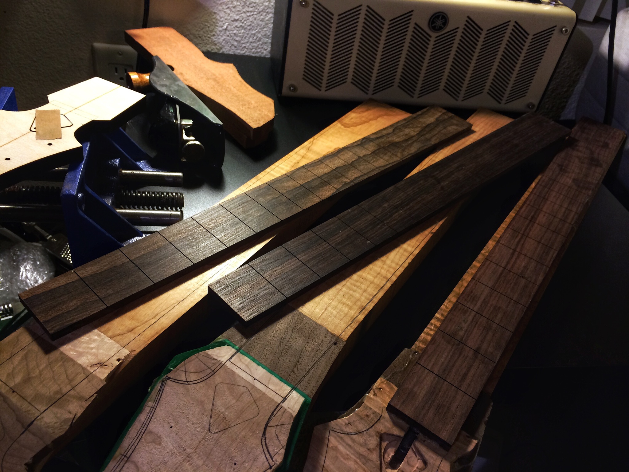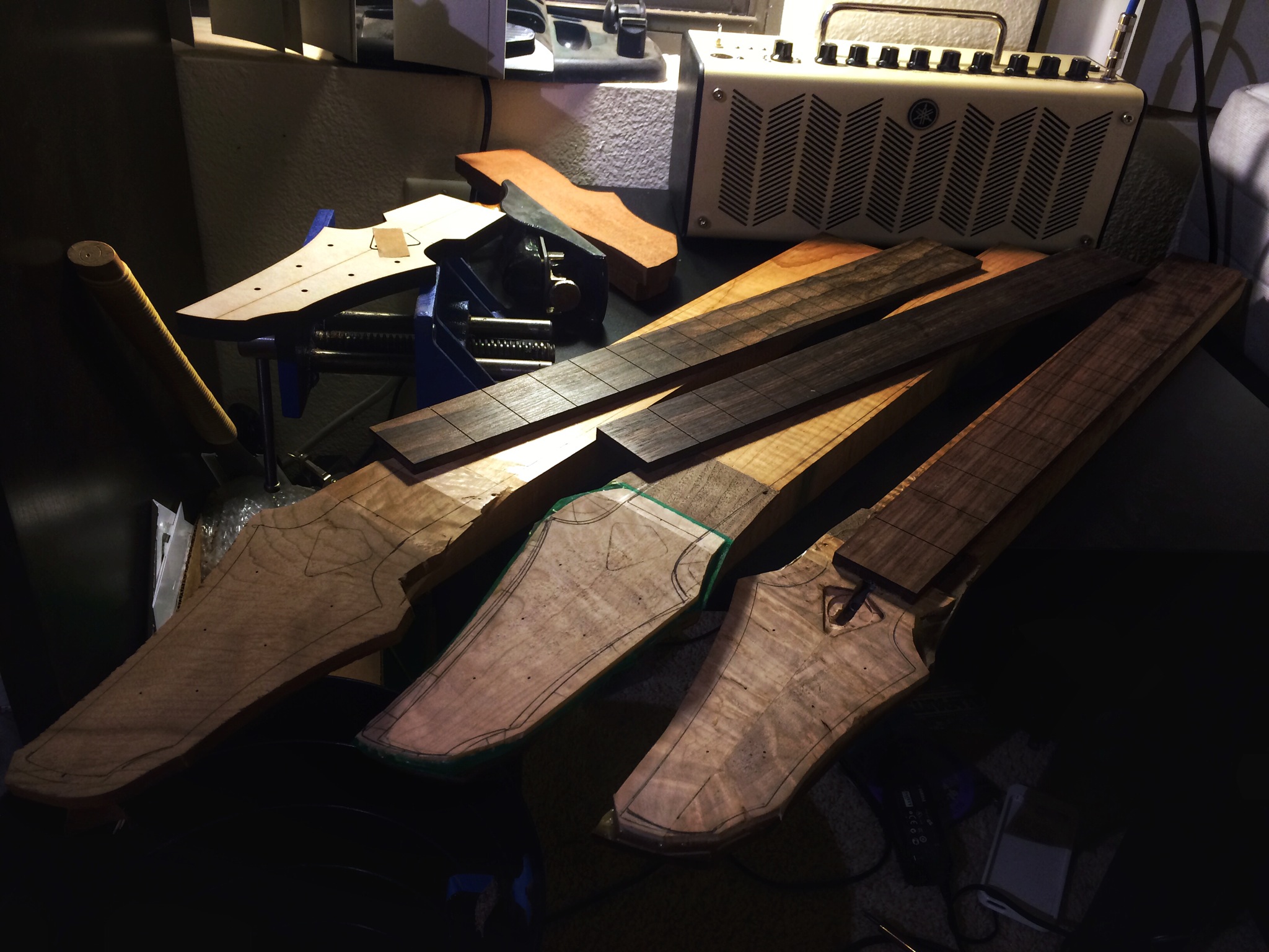 Alright, medical residency applications (pray for me) are in and now I’m doing seven different things at once. I want to finish these builds so they can go to their owners since they’ve been patiently waiting. The imbuya build is still up for sale. Anyways here’s some pictures. The imbuya and maple builds need profiling first for the headstocks because the binding needs to be installed. Ganesh’s burl maple neck is all set to be profiled, radiused, fretted and carved. I’ll add a veneer on the back and make a slight volute. Things are looking good.