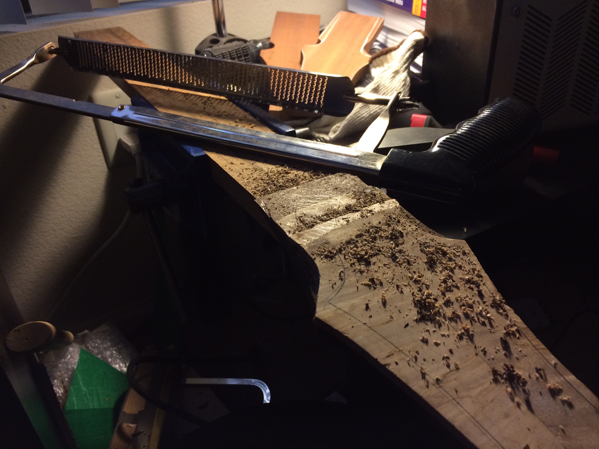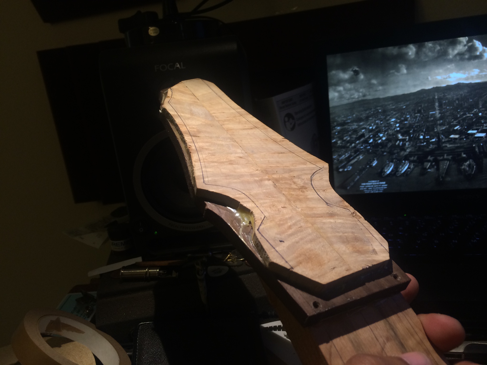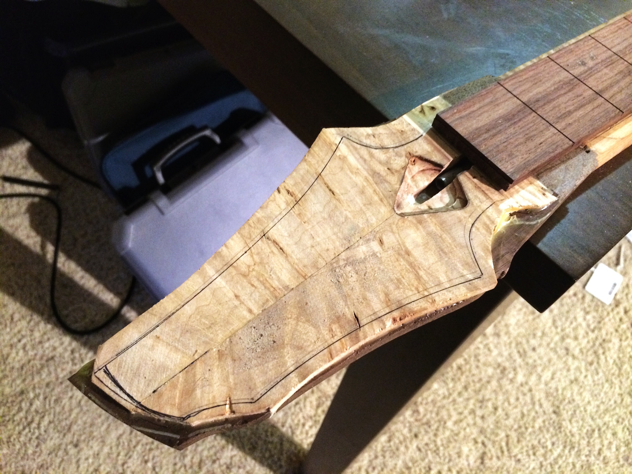 Alright, medical residency applications (pray for me) are in and now I’m doing seven different things at once. I want to finish these builds so they can go to their owners since they’ve been patiently waiting. The imbuya build is still up for sale. Anyways here’s some pictures. The imbuya and maple builds need profiling first for the headstocks because the binding needs to be installed. Ganesh’s burl maple neck is all set to be profiled, radiused, fretted and carved. I’ll add a veneer on the back and make a slight volute. Things are looking good.