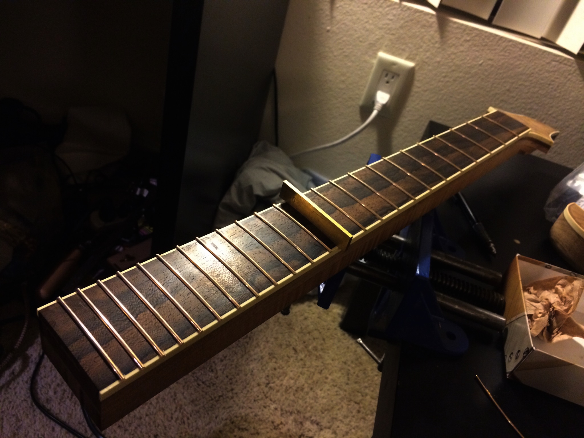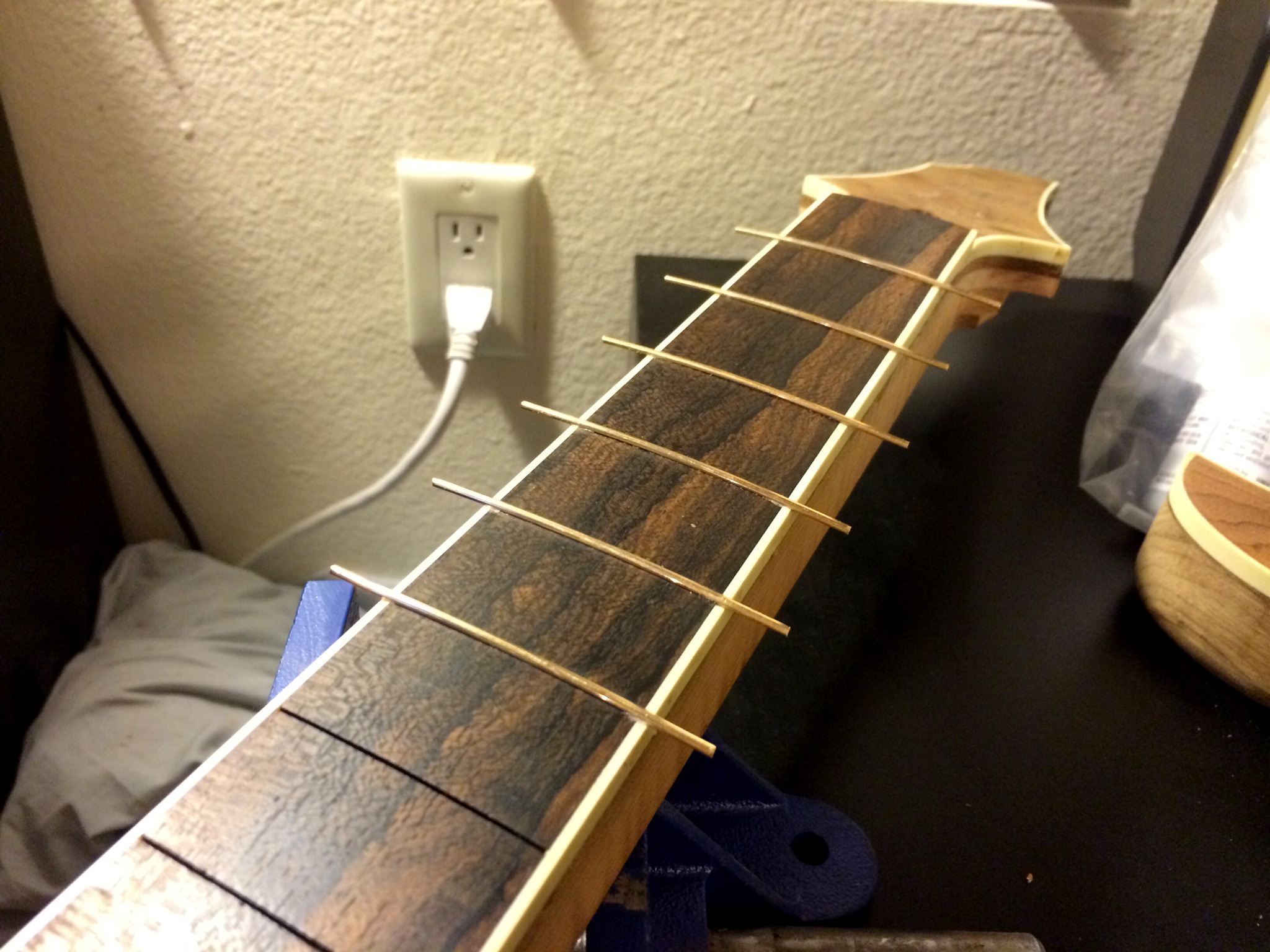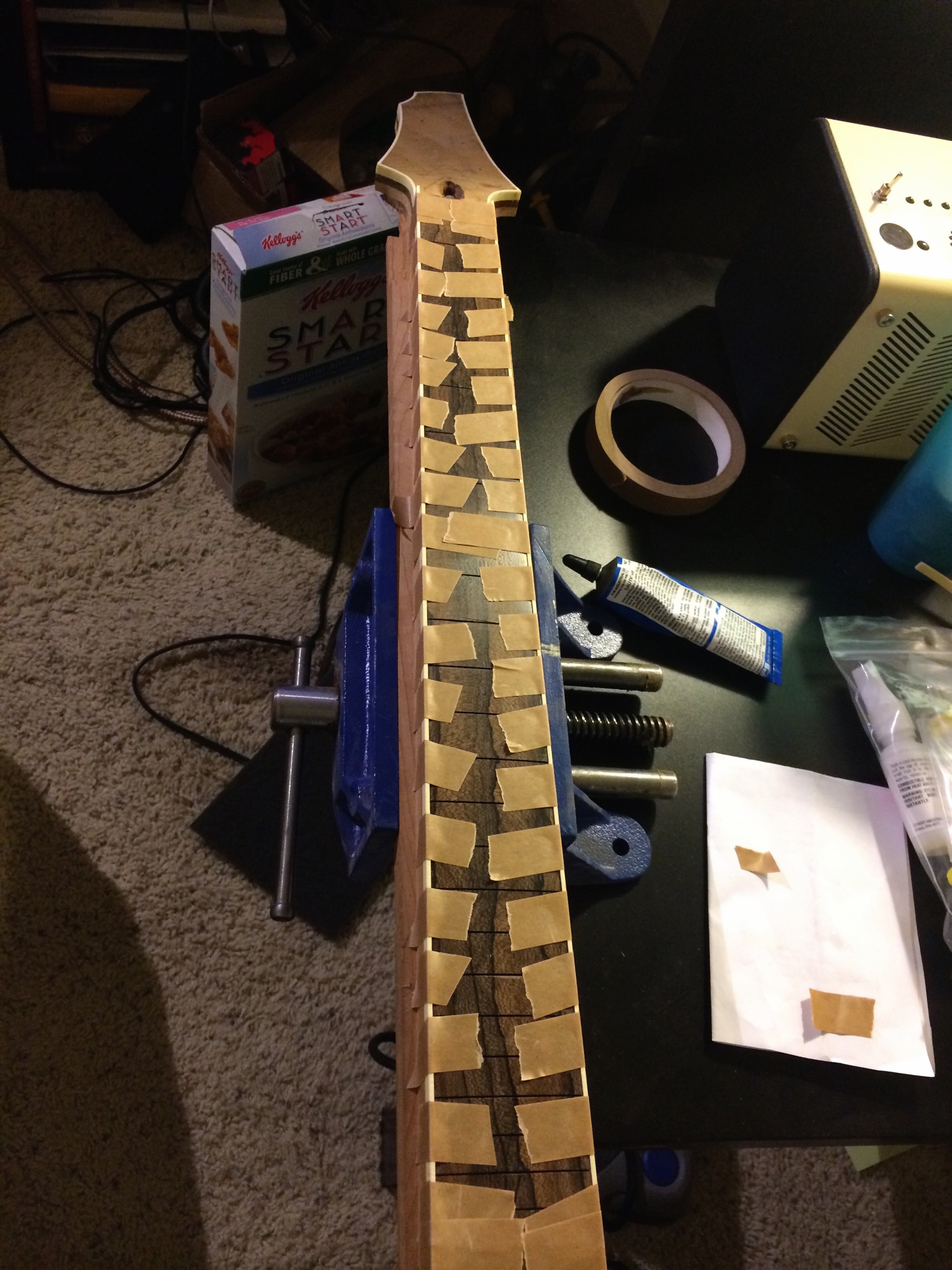 I also used Joel’s method of pressing in frets using the horizontal press since I had a small portable one. Worked pretty well. I’d filled a glue syringe with some water and titebond and used that in the slots to take up space around the tang. I used a dab of thick CA on the ends where I clipped the tangs for the bindings so it’ll stick to the edges of the binding when I clamp down. All seems well.