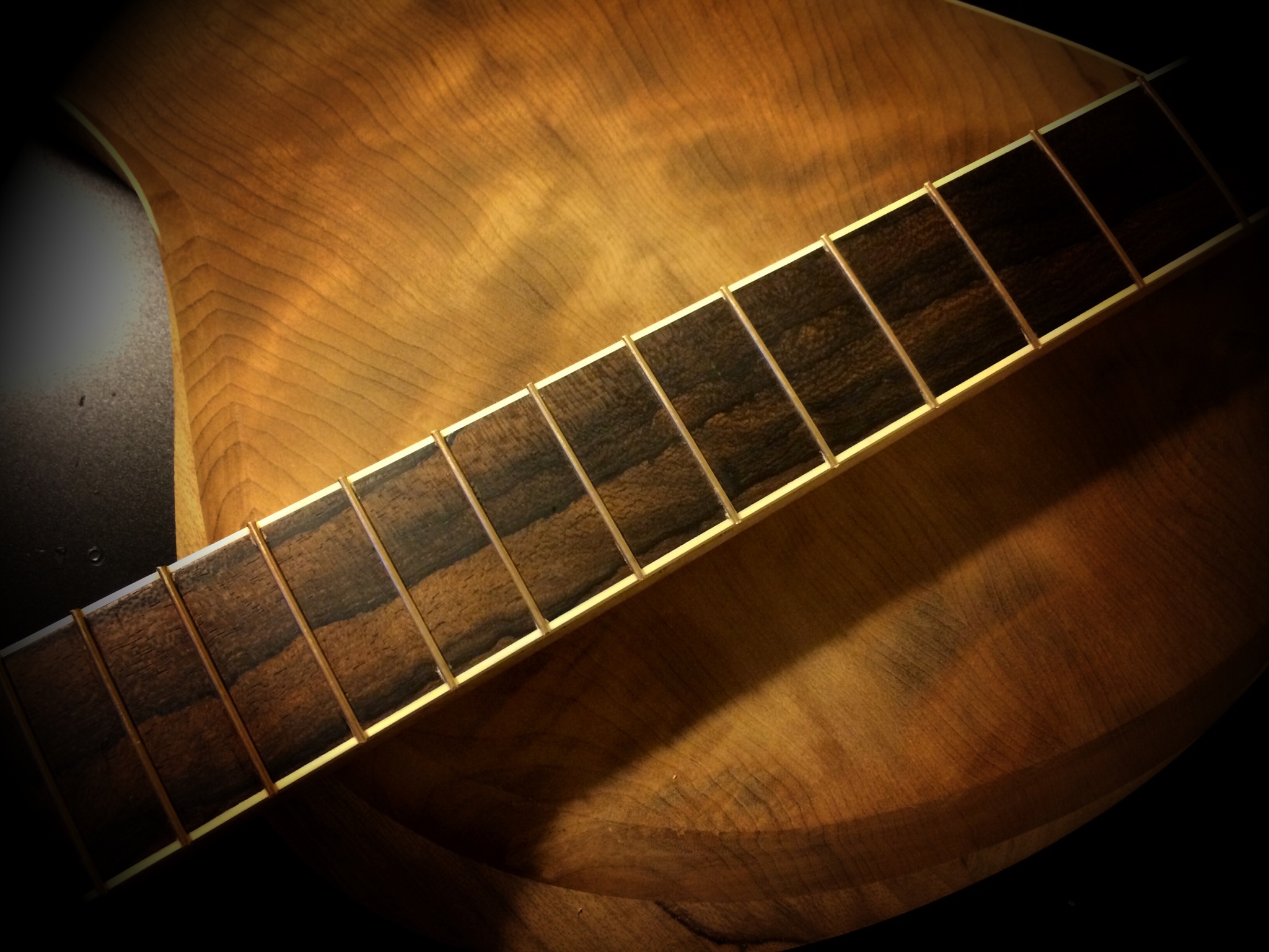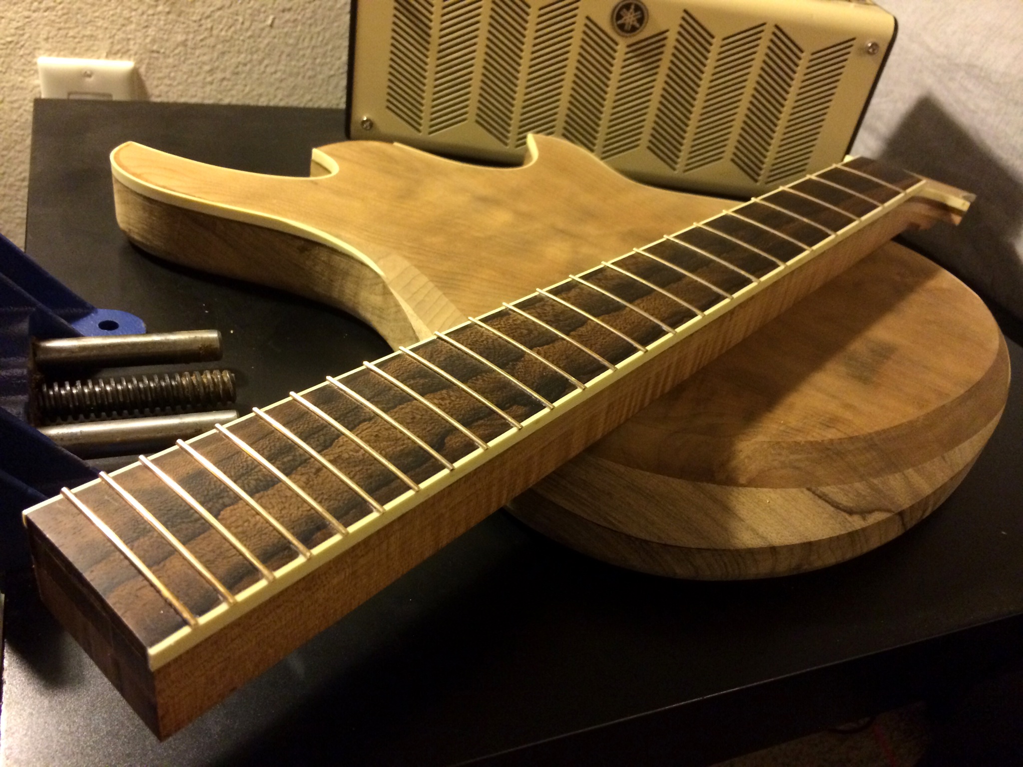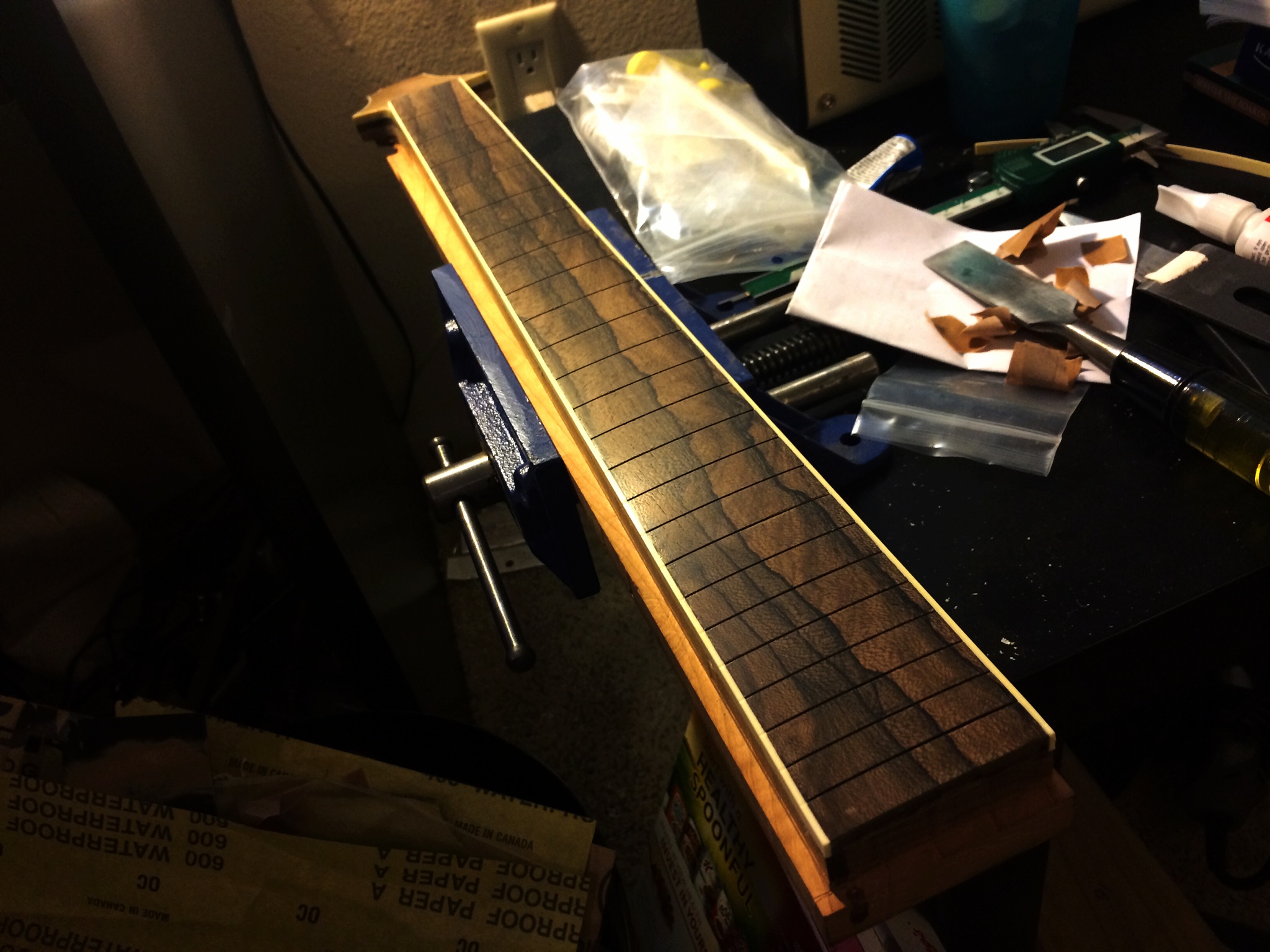 I also used Joel’s method of pressing in frets using the horizontal press since I had a small portable one. Worked pretty well. I’d filled a glue syringe with some water and titebond and used that in the slots to take up space around the tang. I used a dab of thick CA on the ends where I clipped the tangs for the bindings so it’ll stick to the edges of the binding when I clamp down. All seems well.