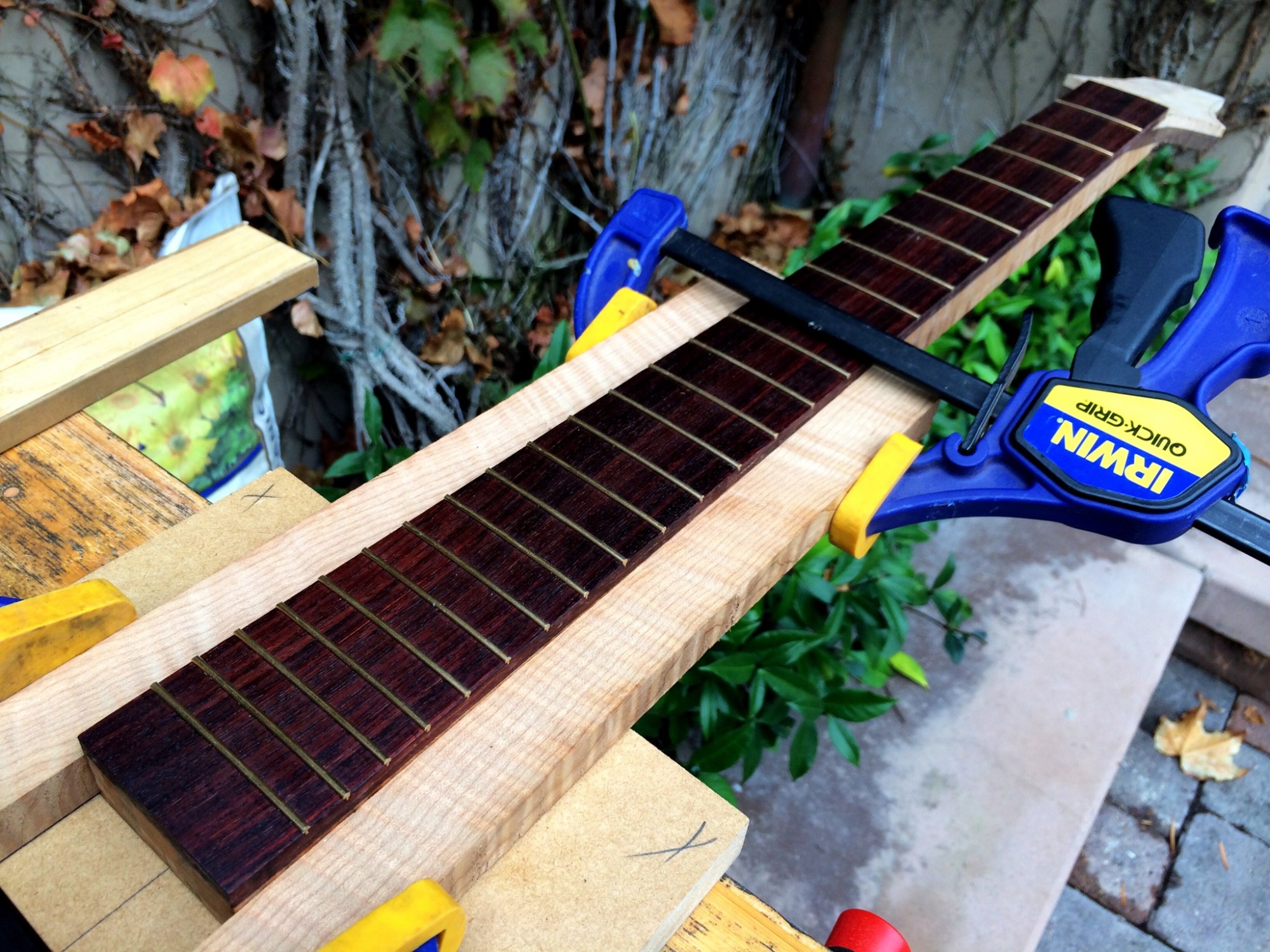 I wanted to make a perfect neck pocket for Ganesh’s build and so I mapped it all out and started mounting the side rails for the router when it began to rain. I’ll get back to it on Sunday. Just the neck pocket, cavities and neck shaping left. It’s nearly complete!!! His Indian rosewood fingerboard is just stunning in person, esp with those gold evo frets.
