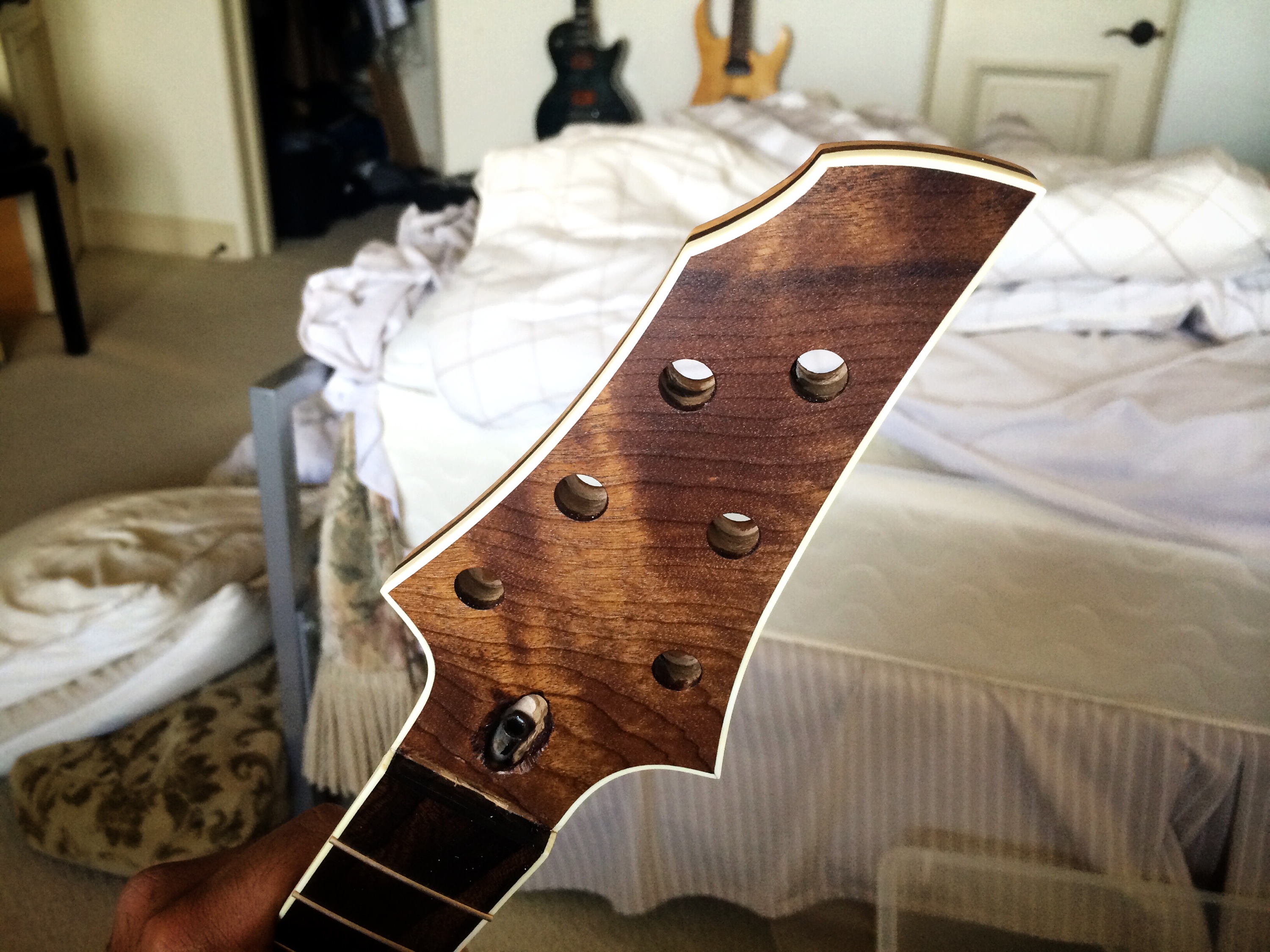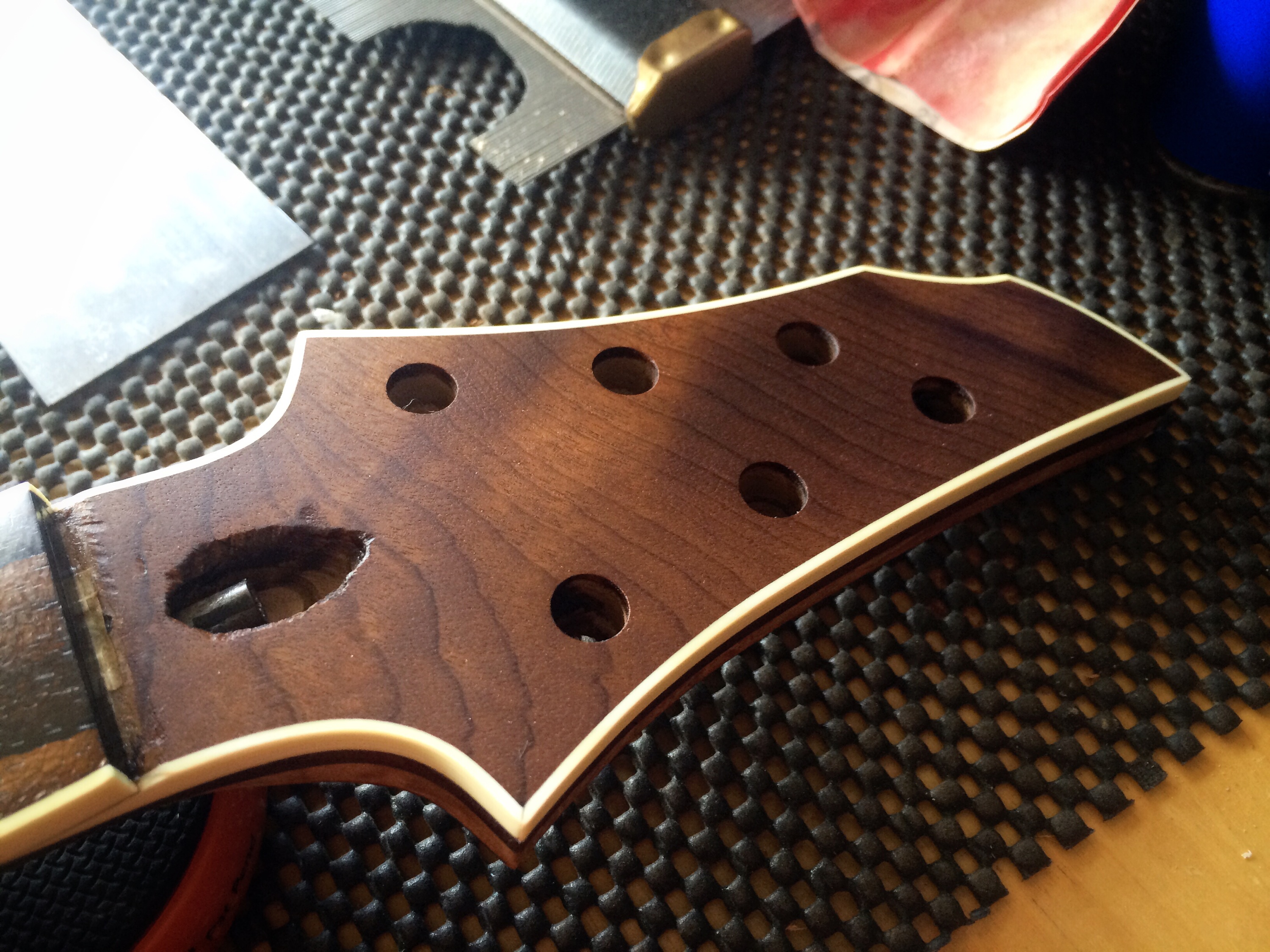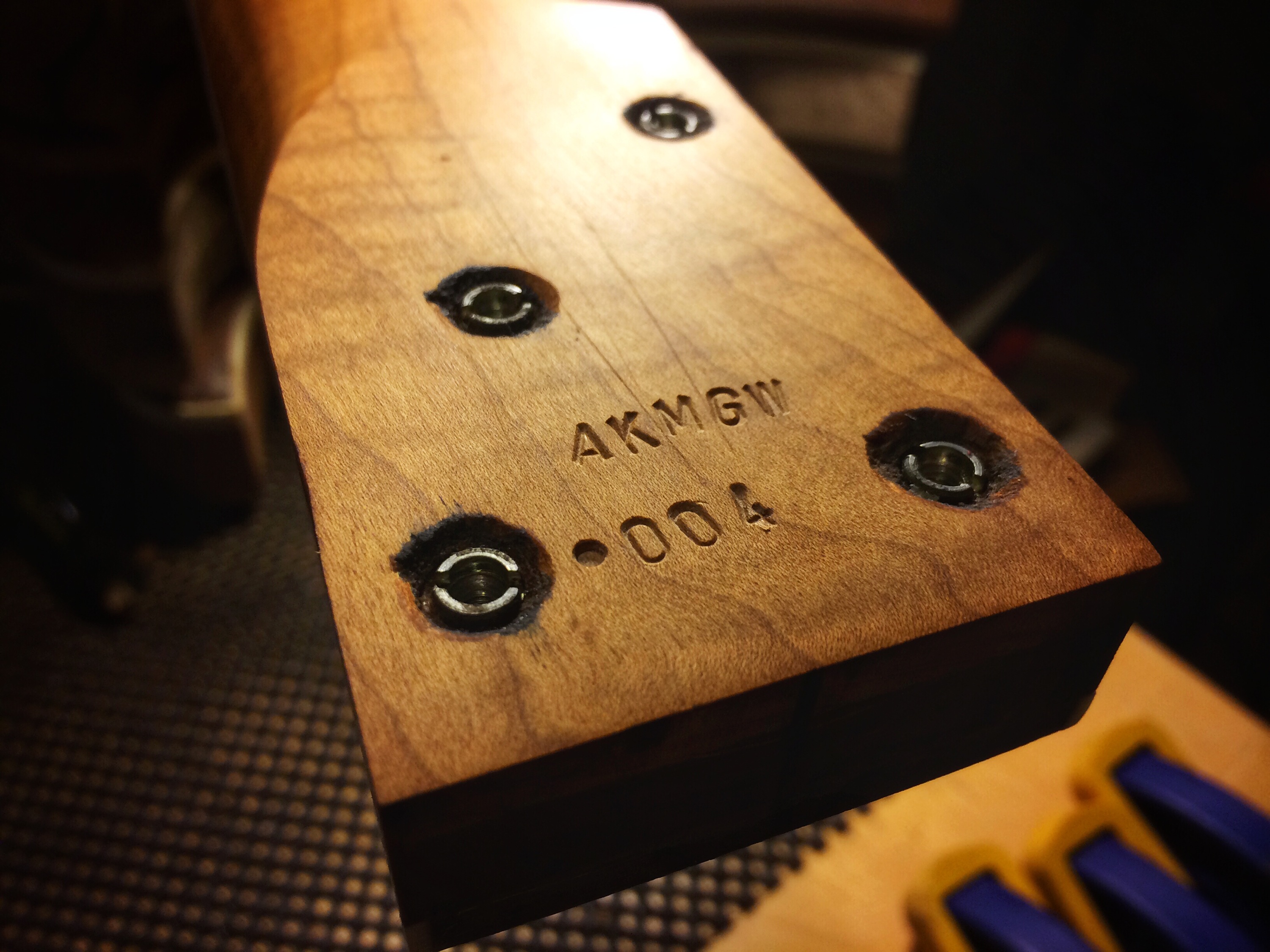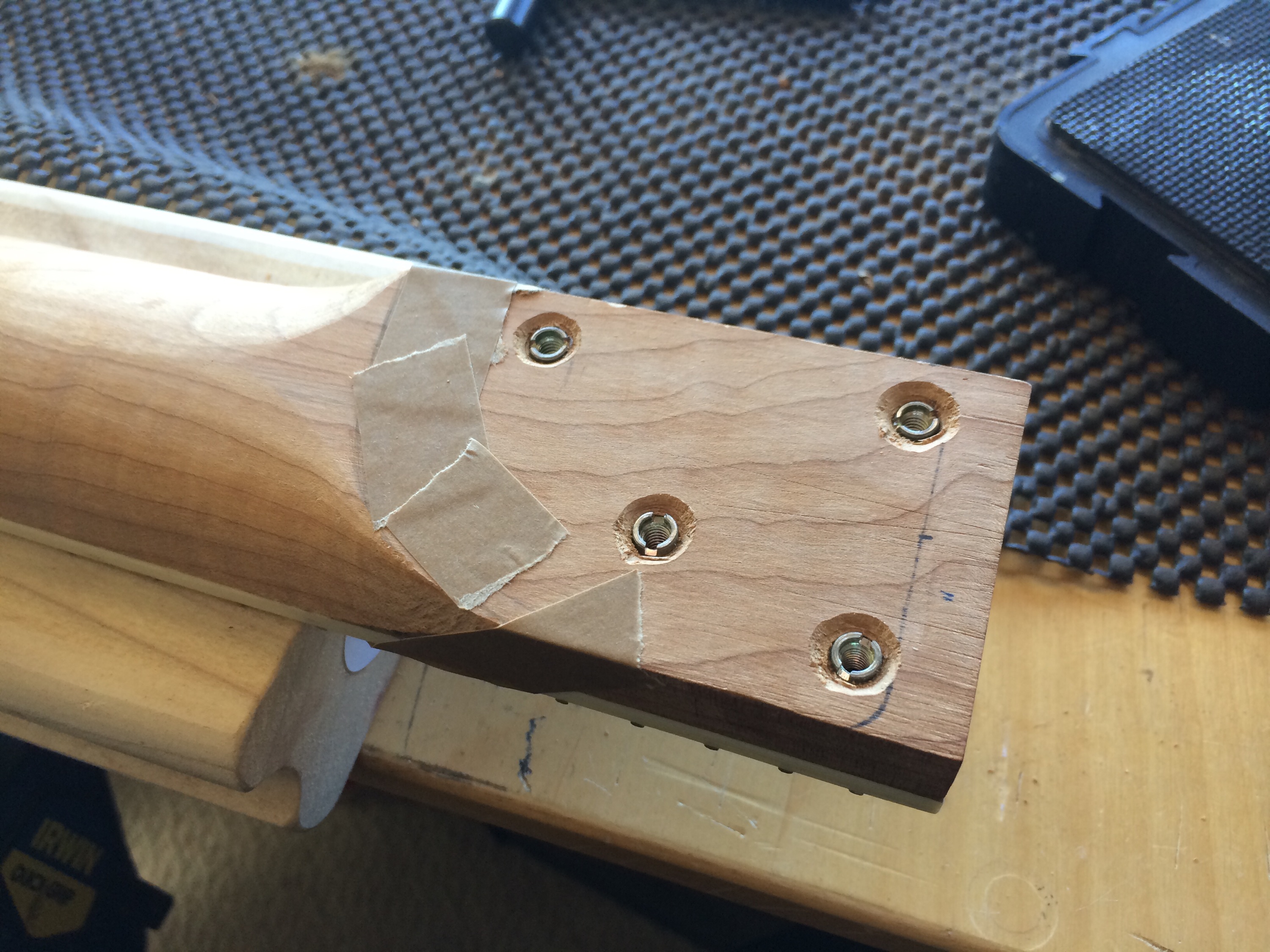 So far I’ve also installed the stainless steel threaded inserts and stamped the heel end. I’m using 8-32 stainless steel angles flat head machine screws with these pretty (and expensive) finishing washers. They look really cool though and are very secure. I was initially concerned with them but figured I should give then a try. I also used a 10 mm forstner bit for the tuning machines and there was ABSOLUTELY NO TEAROUT. I loath drilling tuning machine holes and this was so smooth I almost cried. So we’re all good here!