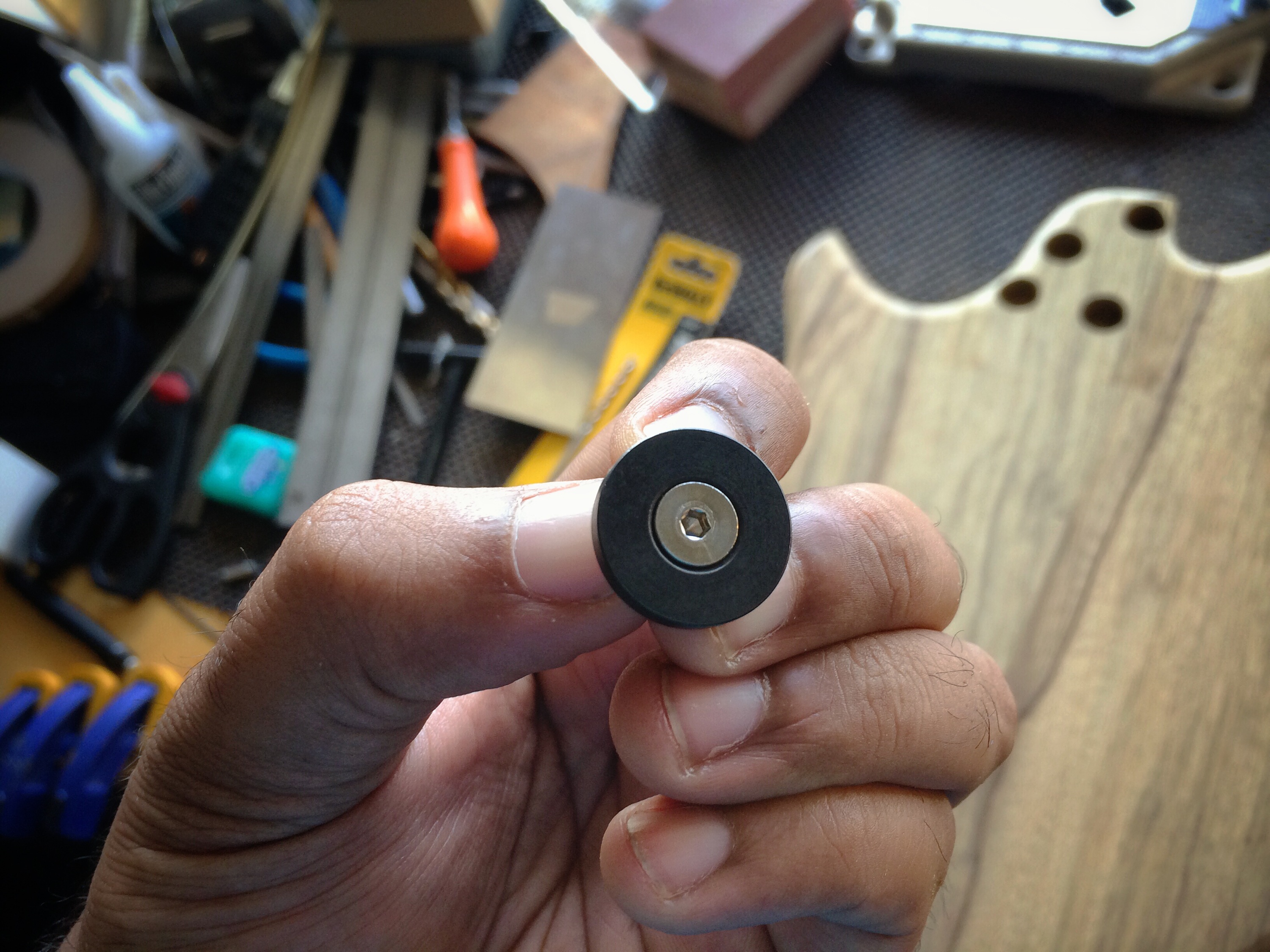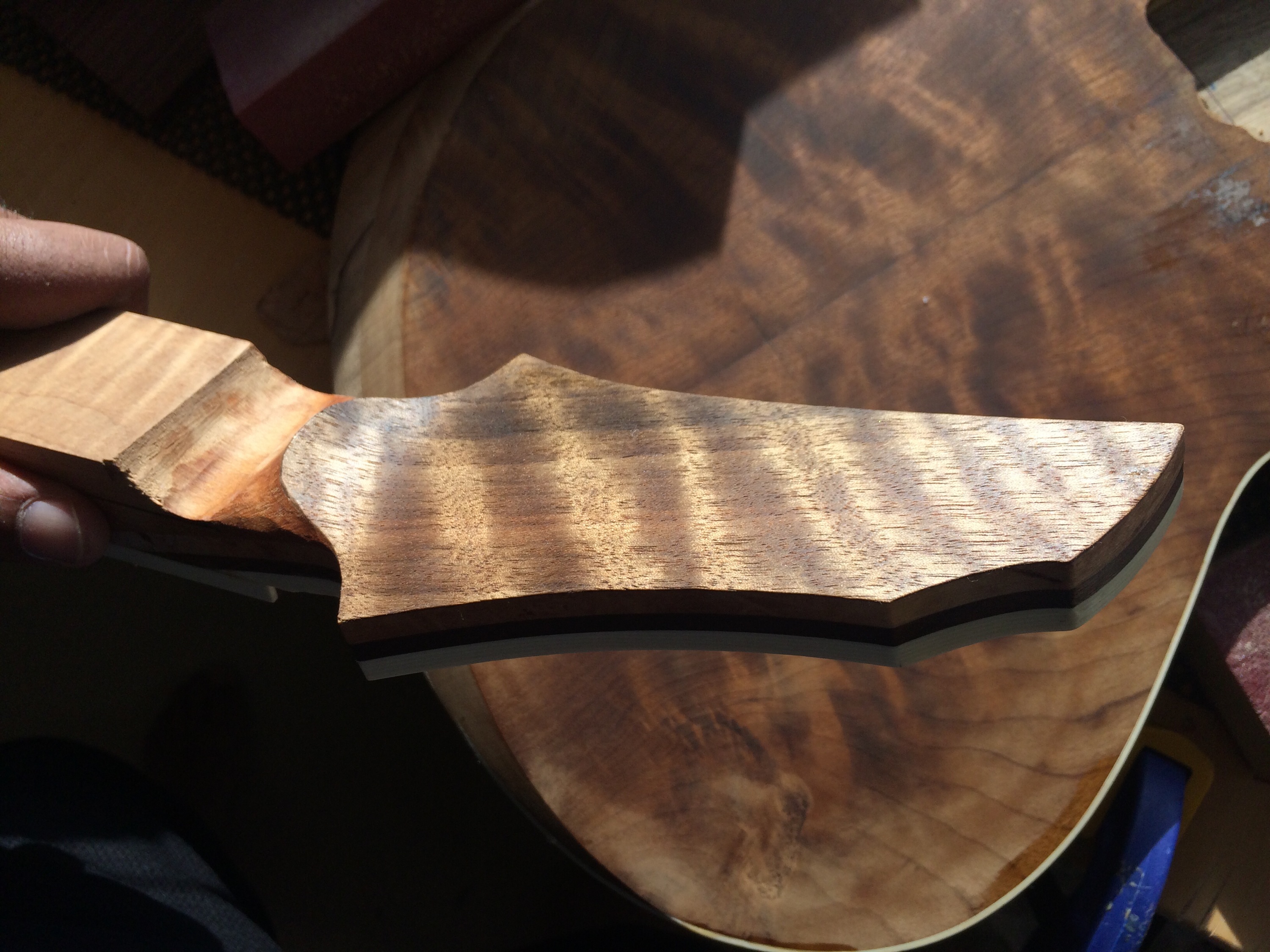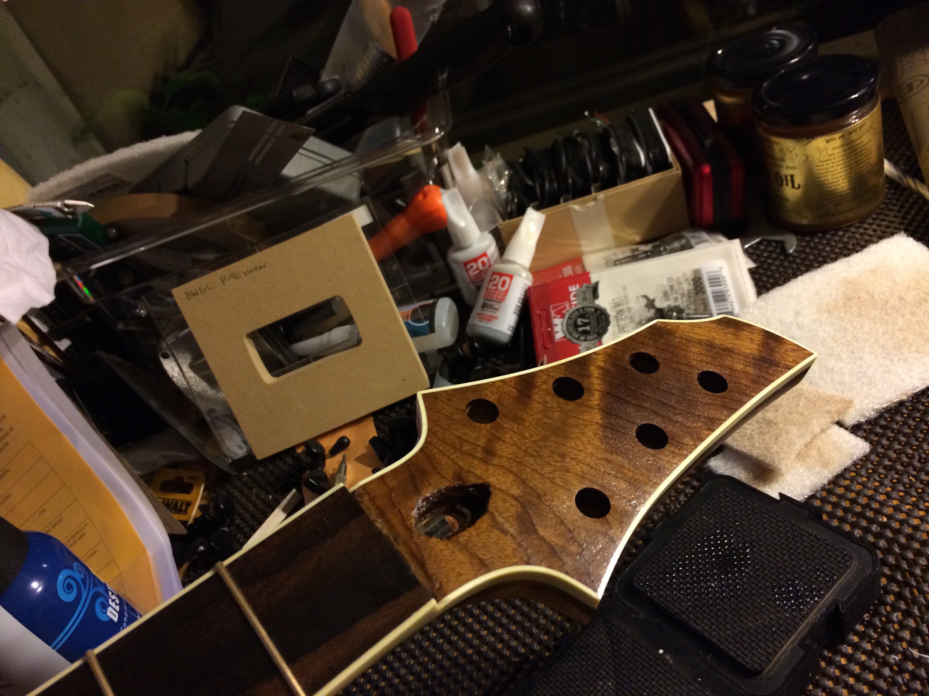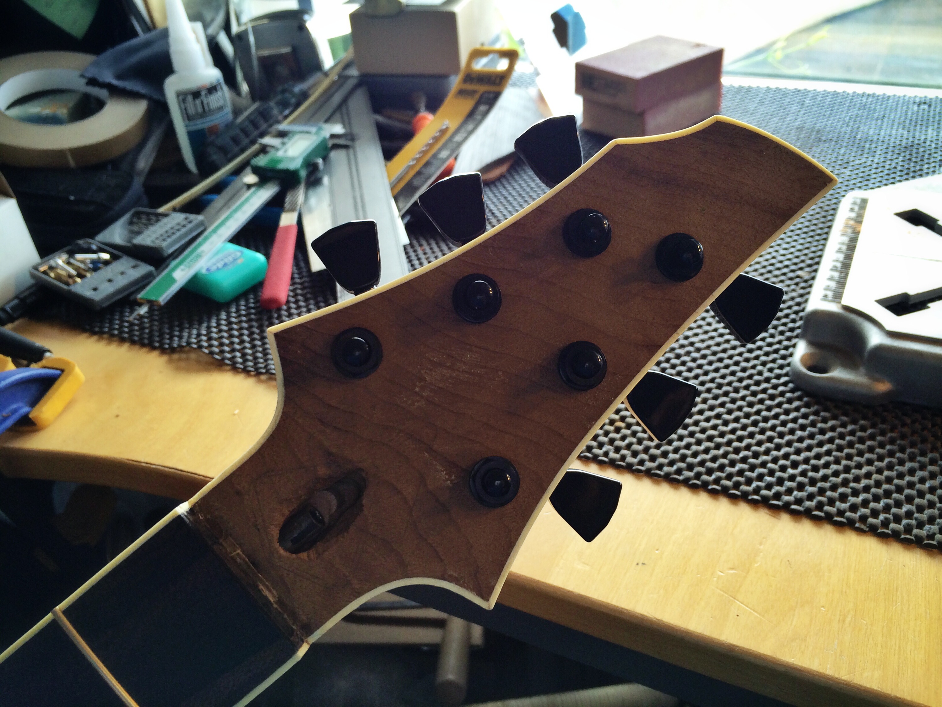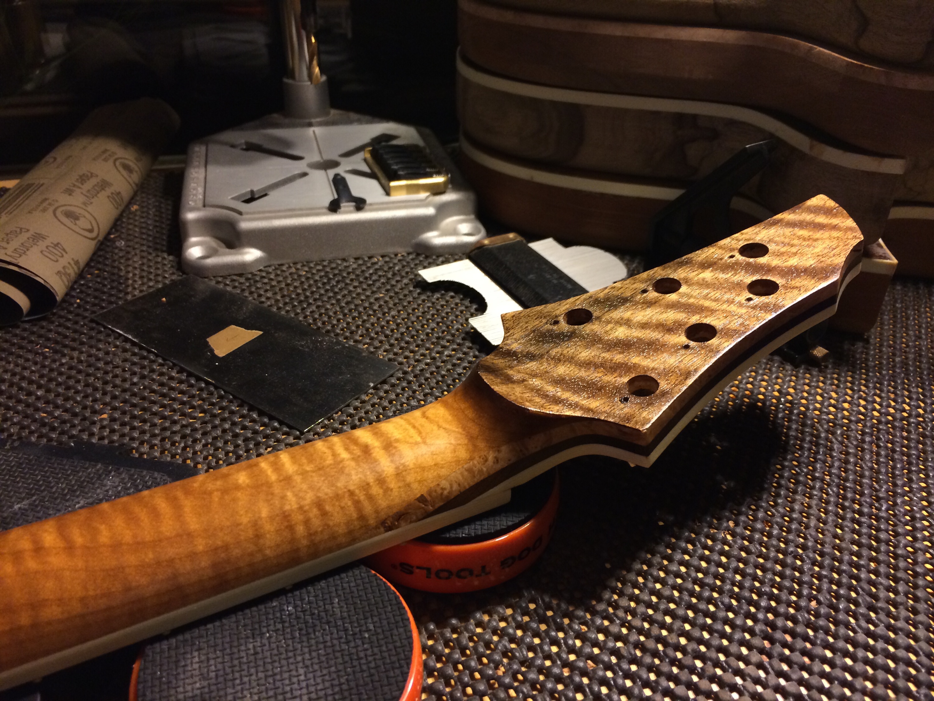 So far I’ve also installed the stainless steel threaded inserts and stamped the heel end. I’m using 8-32 stainless steel angles flat head machine screws with these pretty (and expensive) finishing washers. They look really cool though and are very secure. I was initially concerned with them but figured I should give then a try. I also used a 10 mm forstner bit for the tuning machines and there was ABSOLUTELY NO TEAROUT. I loath drilling tuning machine holes and this was so smooth I almost cried. So we’re all good here!