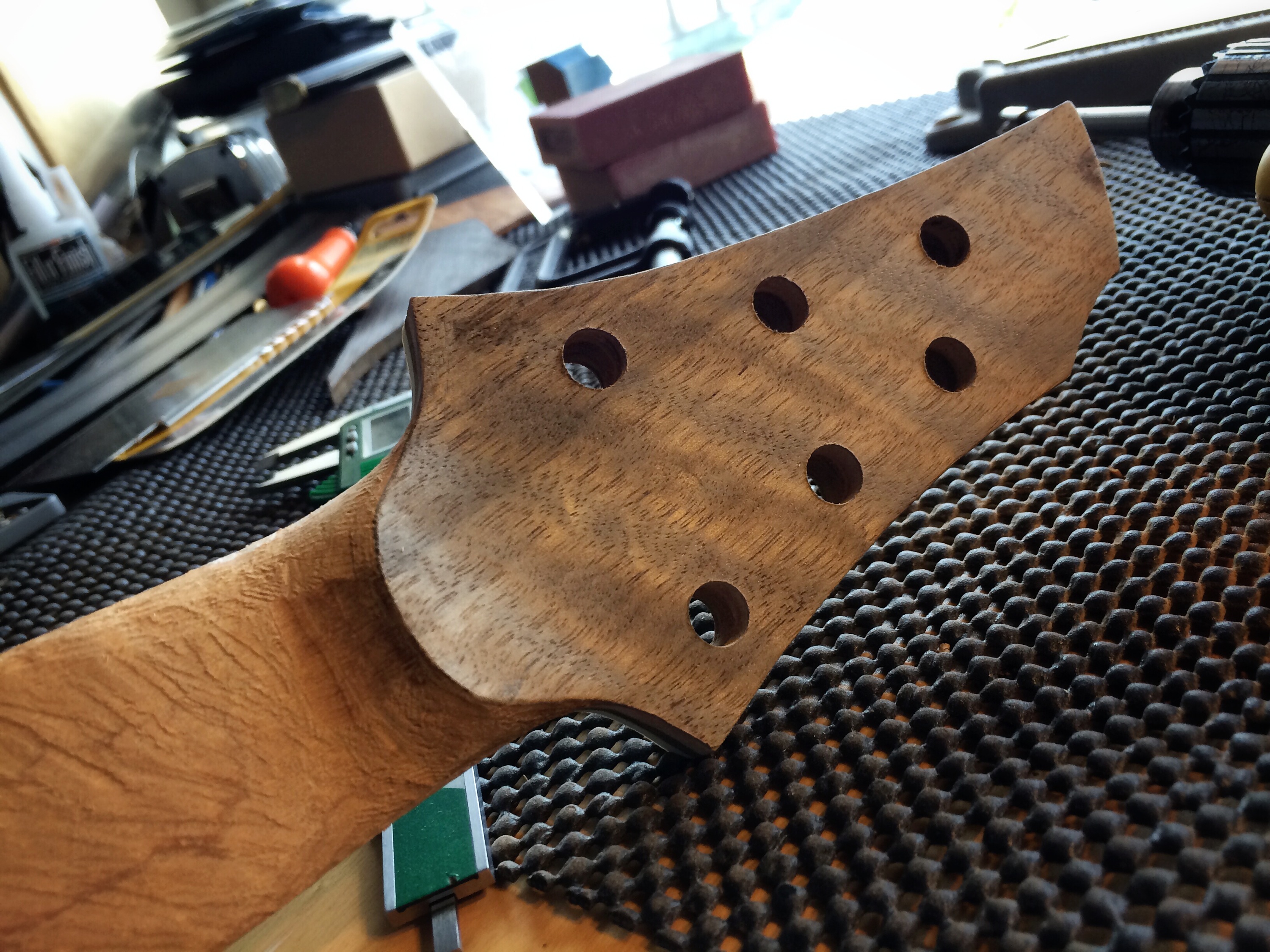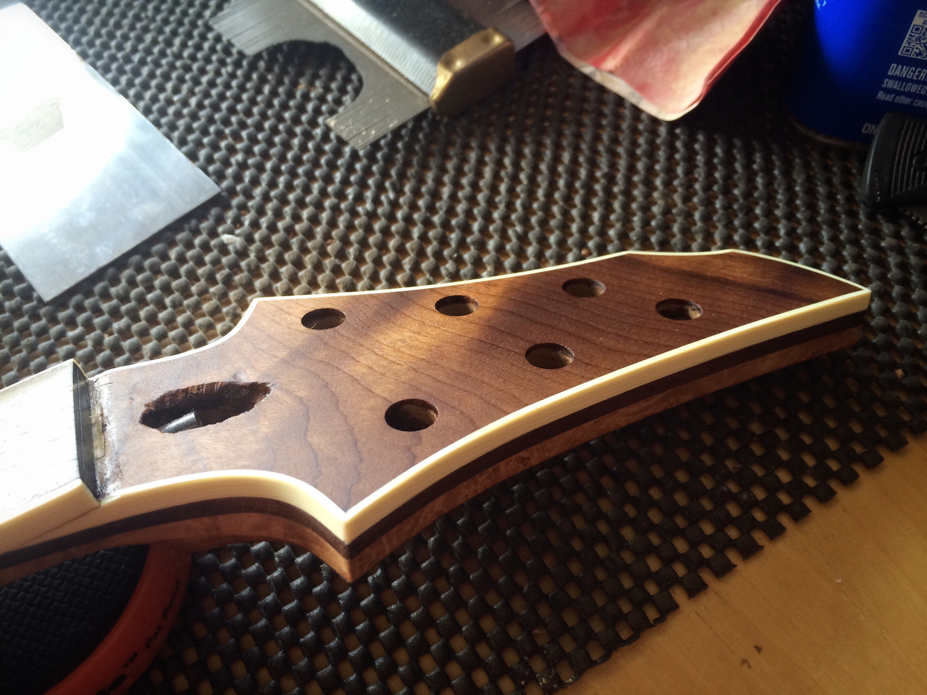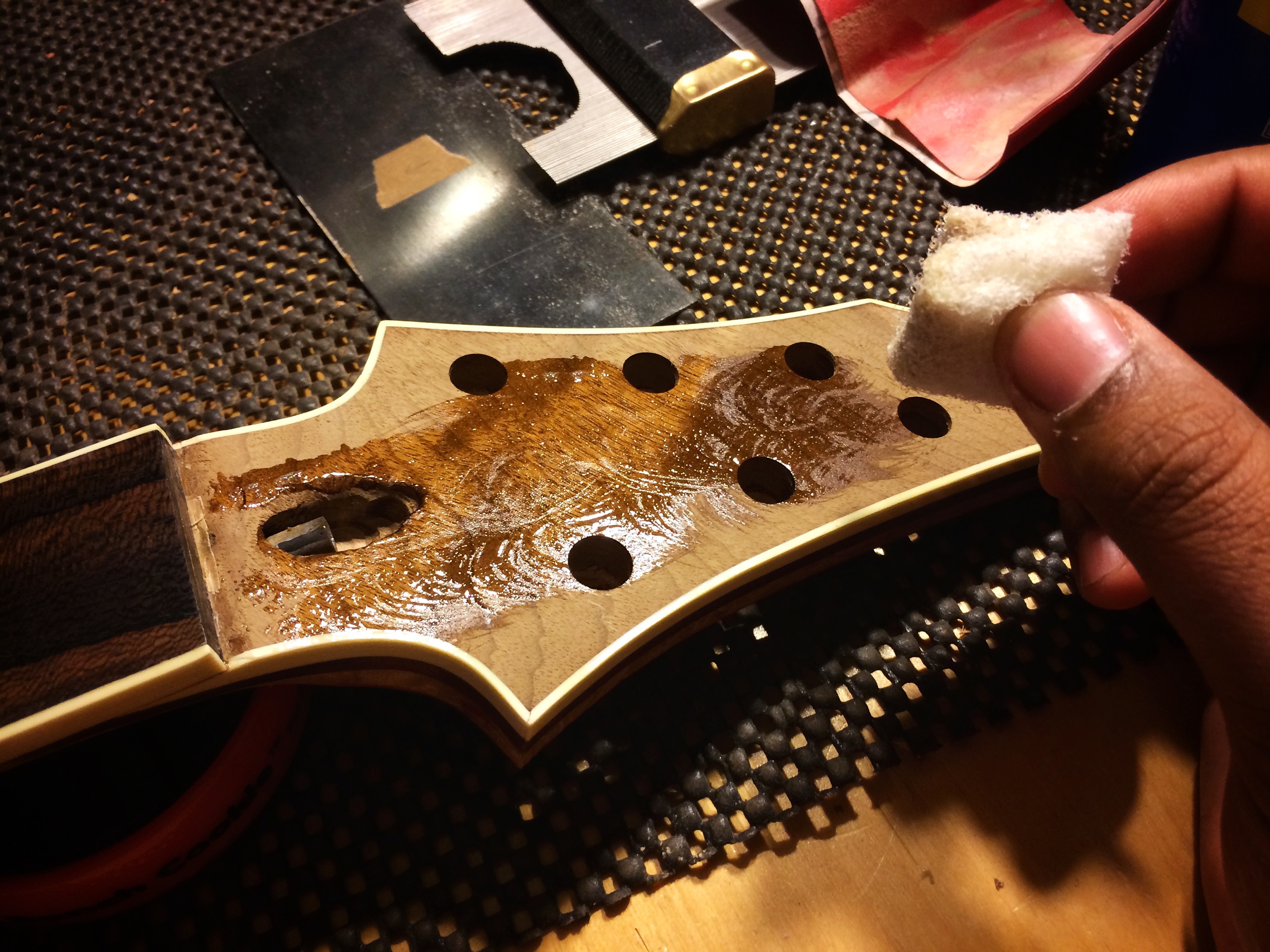 After the neck was carved i scraped until everything was smooth and proceeded straight to 220 grit sandpaper on the finishing sander. It removed the hard lines and after everything was alright I began oiling using Odies Oil. I’ve worked with this stuff enough to know that it’s probably one of my favorite oil/waxes to work with. I’ll basically saturate a square of 0000 synthetic steel wool and keep it handy for constant reapplication. I alternated between the original oil and the oxi oil to allow some darkening to take place over time.