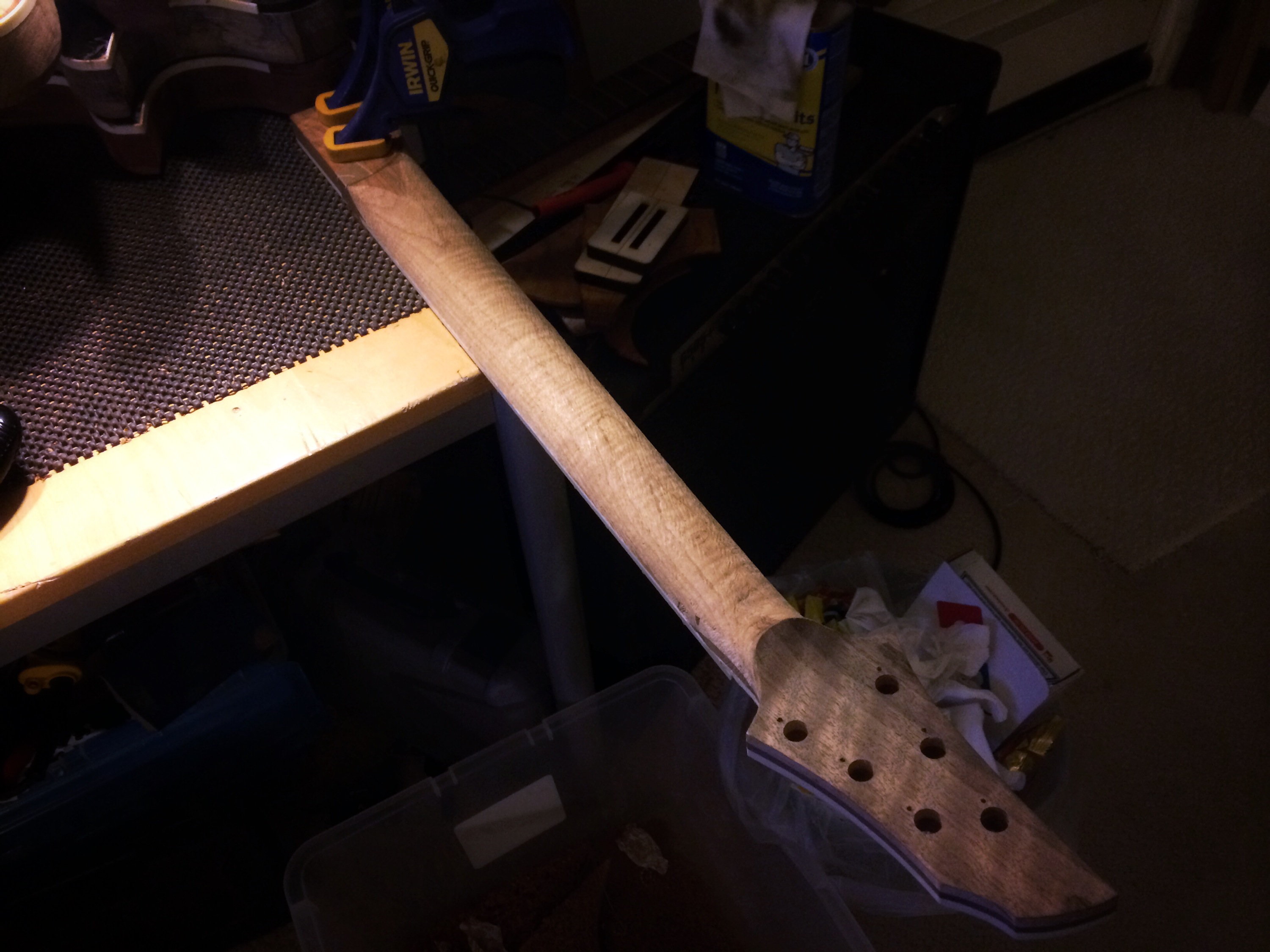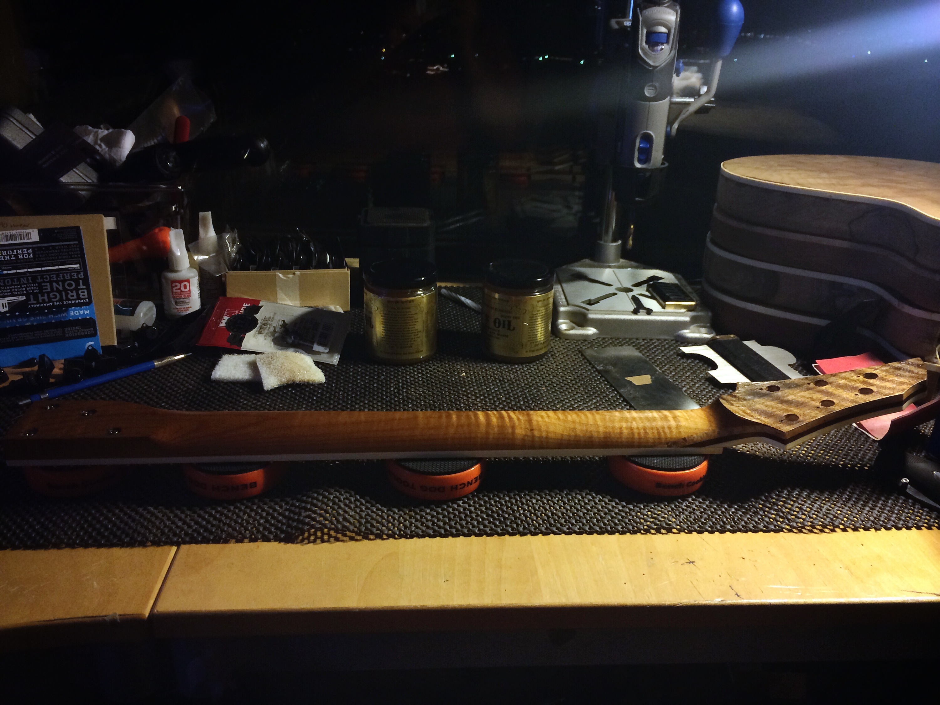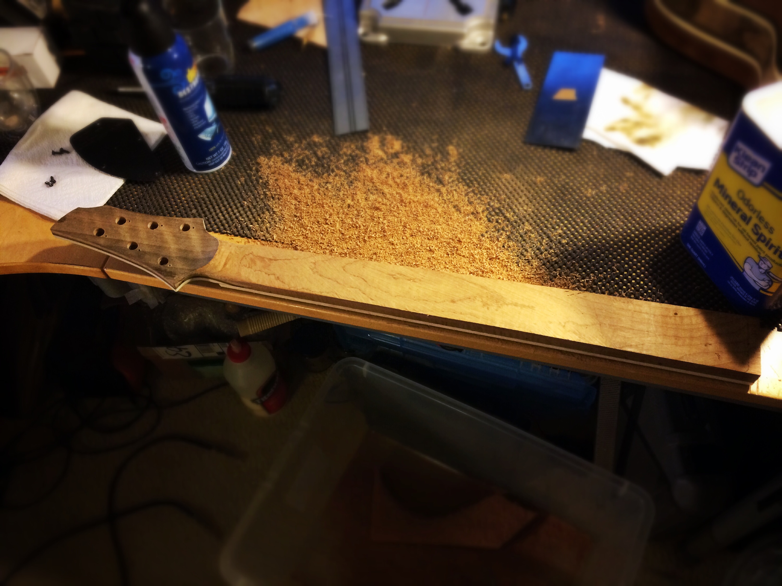 After the neck was carved i scraped until everything was smooth and proceeded straight to 220 grit sandpaper on the finishing sander. It removed the hard lines and after everything was alright I began oiling using Odies Oil. I’ve worked with this stuff enough to know that it’s probably one of my favorite oil/waxes to work with. I’ll basically saturate a square of 0000 synthetic steel wool and keep it handy for constant reapplication. I alternated between the original oil and the oxi oil to allow some darkening to take place over time.