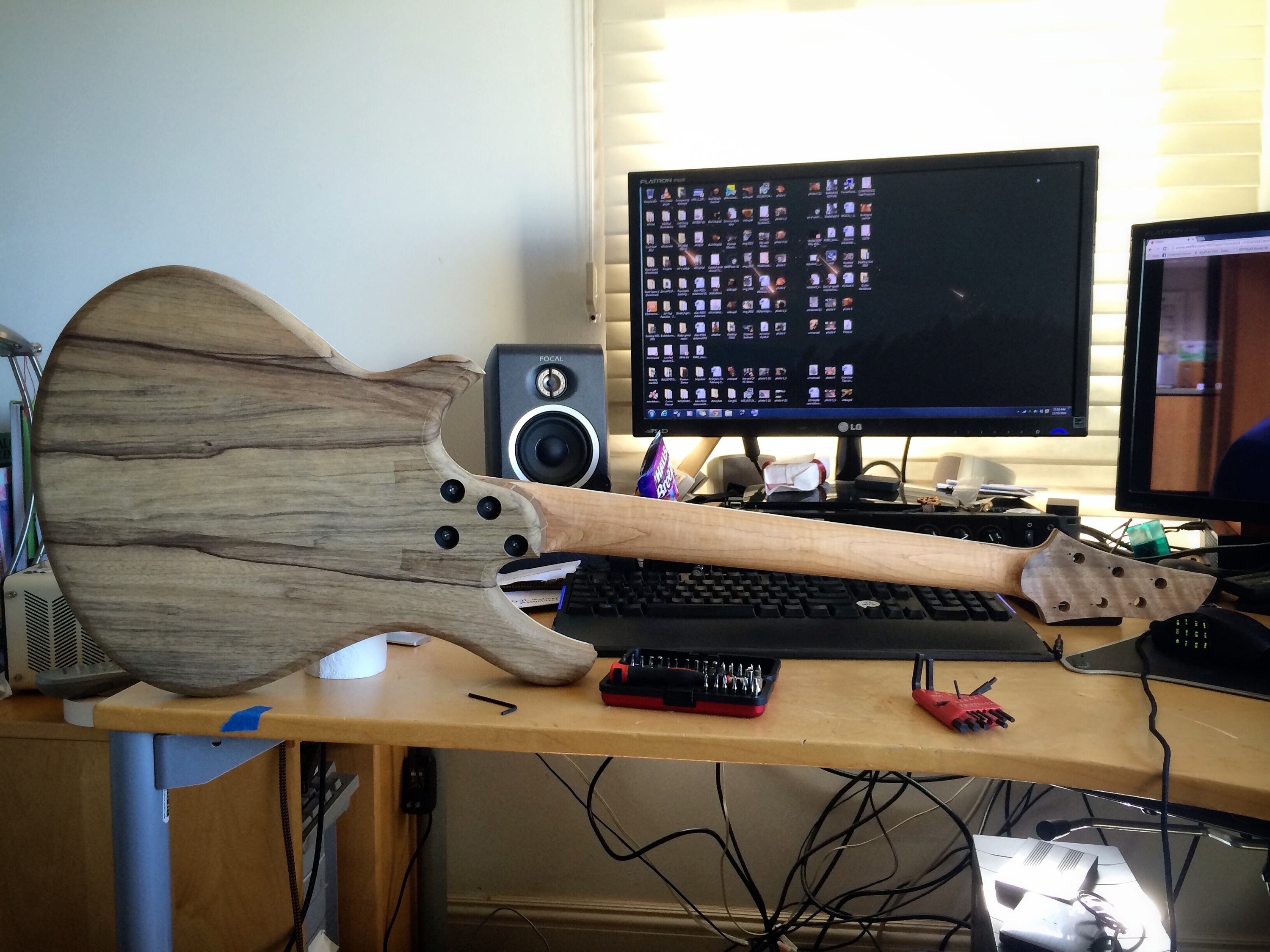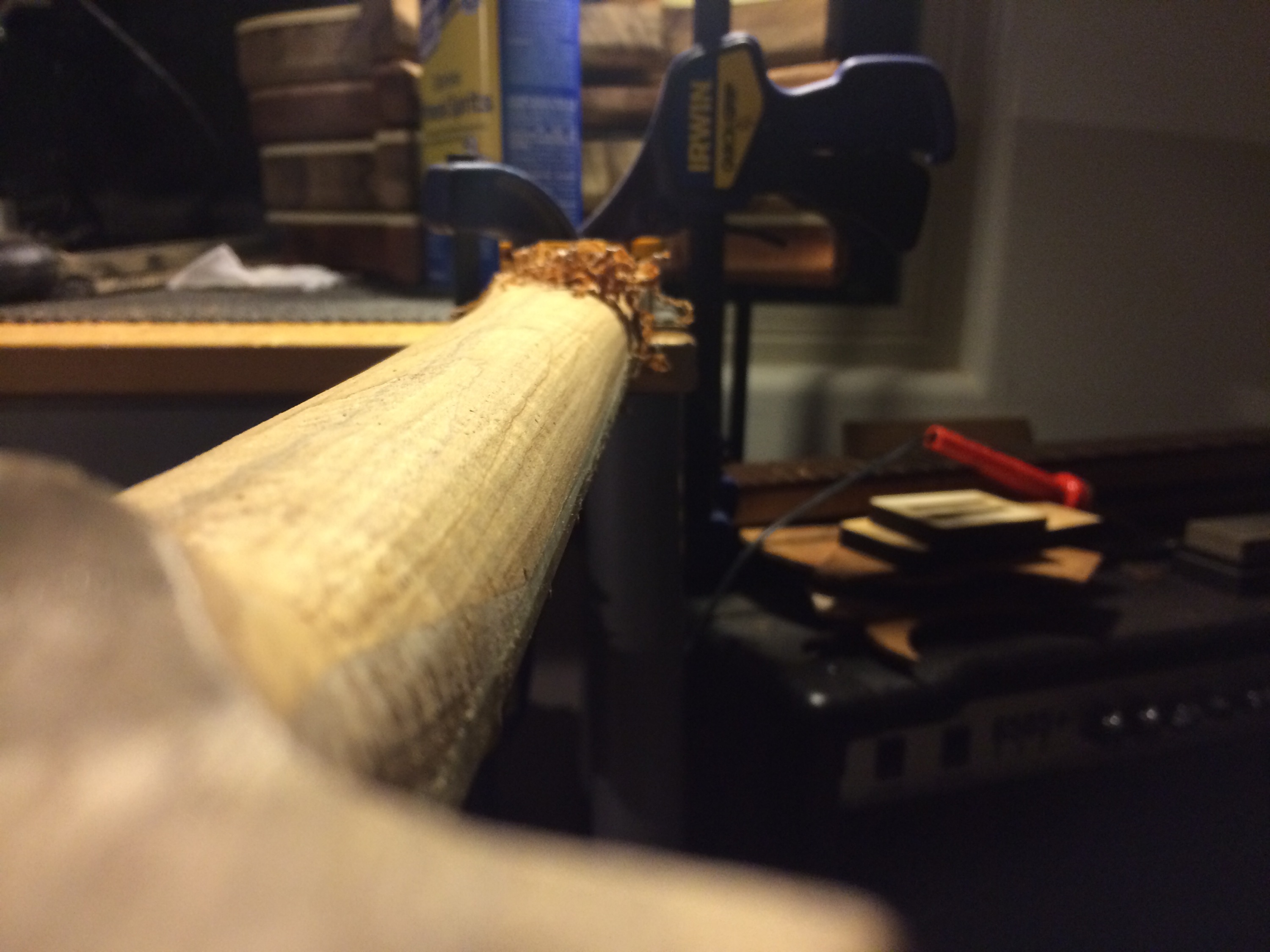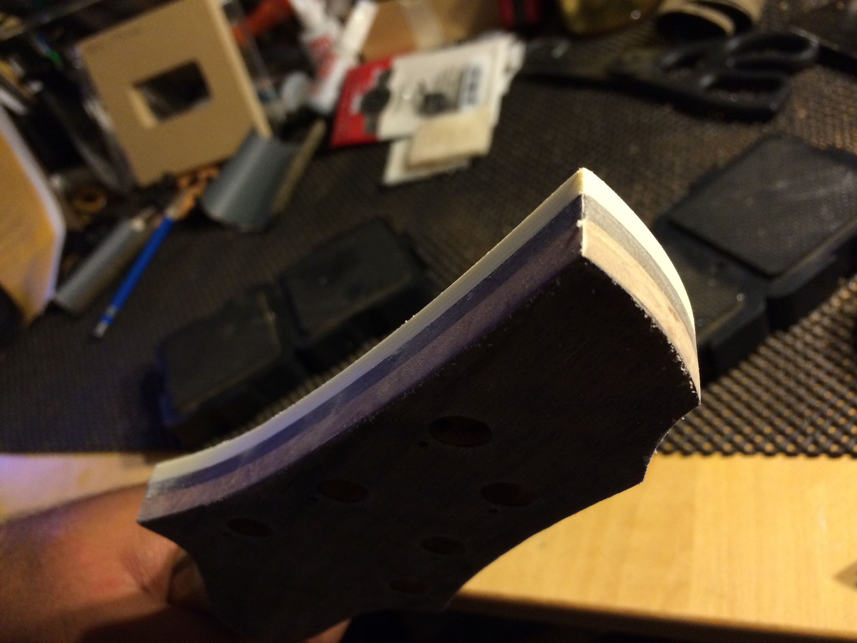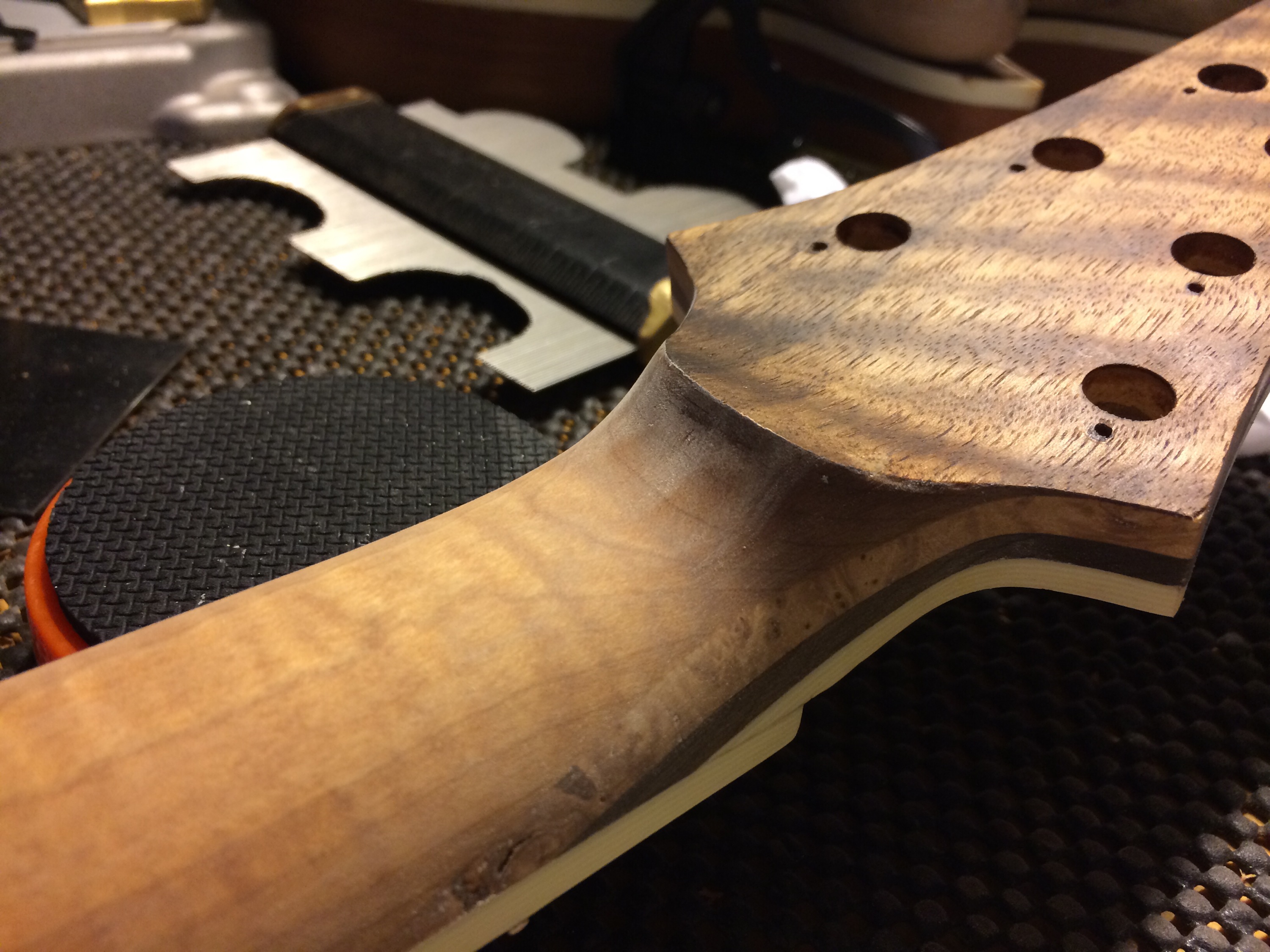 I then kept my calipers handy as I measured the thickness of the neck total. From the middle of the fretboard to the middle of the neck. I realized over the years I’d just blindly accepted a super thin neck as being ‘desirable’ for some reason, and that anything thicker than a wizard neck was just unacceptable. After carving my lasts two official builds, Ryan John’s walnut carved top and Jason Kane’s Roasted maple, I’ve realized that a slightly thicker neck (by only a few mm) yields a much more comfortable playing experience. I believe it has to do with the reduced amount of contraction your lumbricals and thenar/hypothenar muscles have to do by simply filling the space instead of requiring your had to approximate the distance between the back of the neck and the Palm.