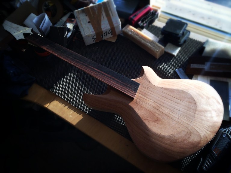Adler is a joy to work with. My microplane rasps cut through it like butter. Now that all bodies for all guitars – somehow I’ve started 5…- are carved, I can begin making all the necks. Roger’s neck is the furthest along and the others will match pace soon enough.