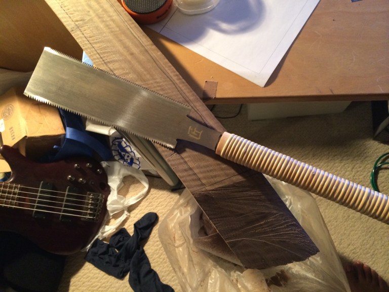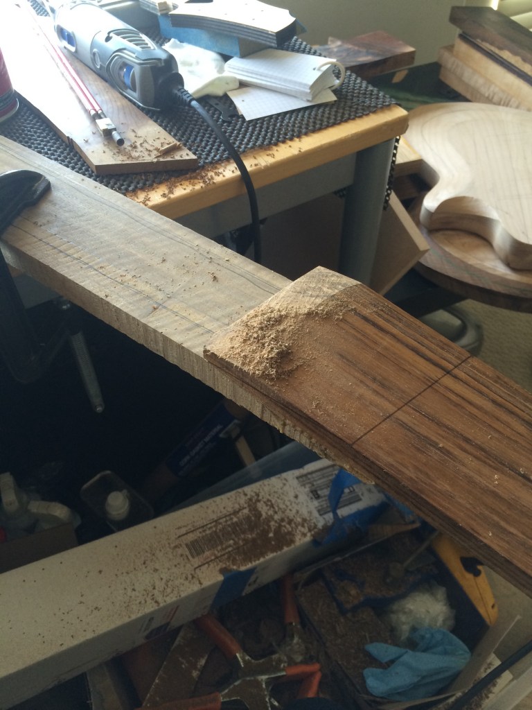 This was a really interesting scarf joint to cut. Typically when I cut a scarf joint my blade wanders a bit and its to be expected. This time im deliberately trying to make my blade wander. It turned out quite well and after cutting off some scrap Shedua I had lying around, I had a headpiece. I glued it using only four clamps this time. Two giant squeeze triggle camps and two C clamps. After curing, I took my microplane hacksaw attachment and shaved off the majority of the headpiece that was above the plane of the neck wood. Then when there was only a few mm left, I used both my block plane and Murkars high angle smoother to level the entire thing out. Its really quite a zen feeling when the blades are sharpened and you go to town on some highly figured woods.