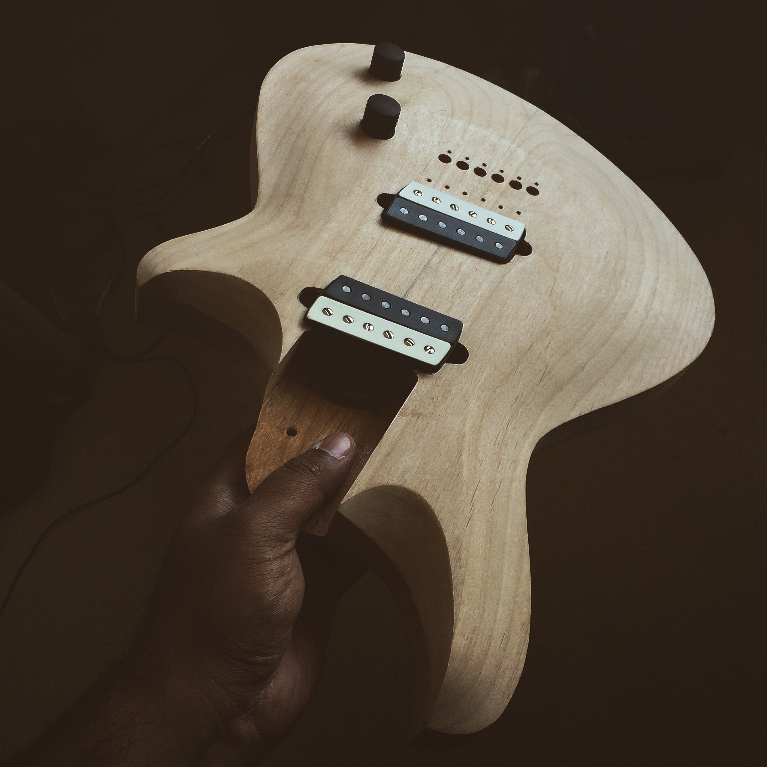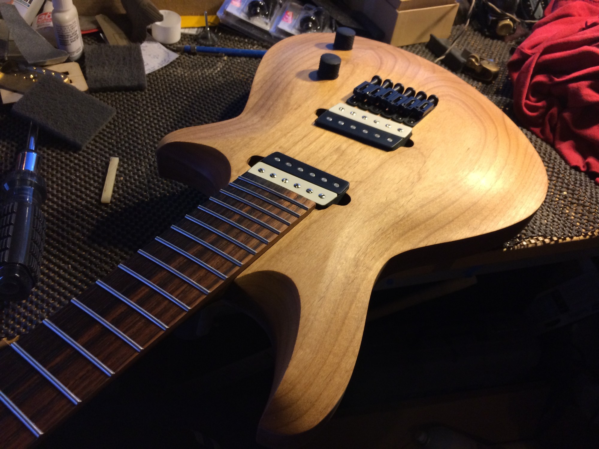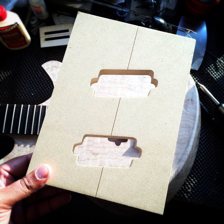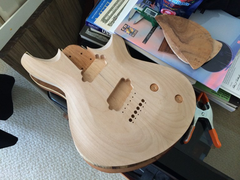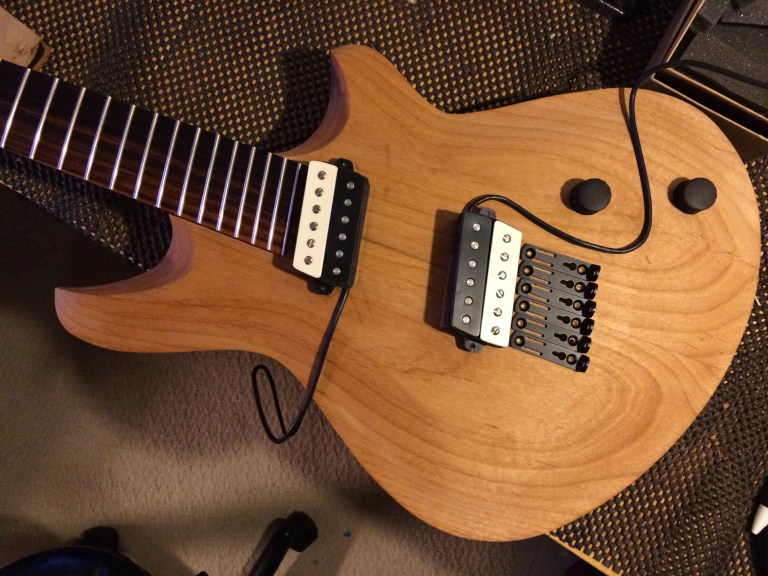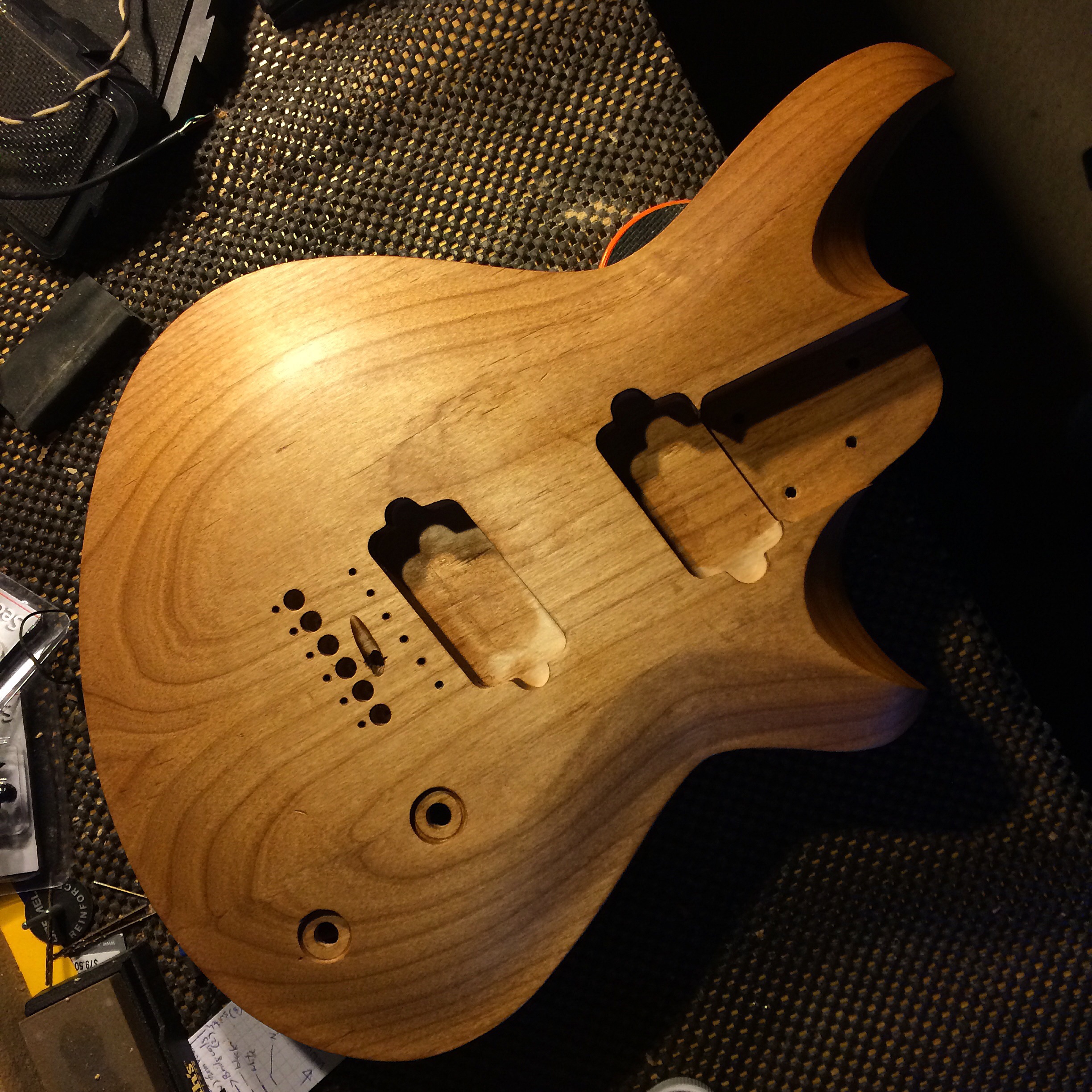 It’s all done! I left the back roughed up and then skipped grits to smooth out while preserving the rough look. The top is super smooth. I used Waterlox Original for my personal build because I wanted to see how it stood up to the hype. It’s a great finish but smells horrible. I used two coats sanding 220 and 320 then white scotch brite to smooth everything out. Then used Odies Hard Wax. It turned out much better than expected. Honestly I’ll be sticking to Odies in the future because it’s easy to work with and smells amazing while giving the same result. Now it’s off to Joel at Grants Guitars in Fountain Valley.