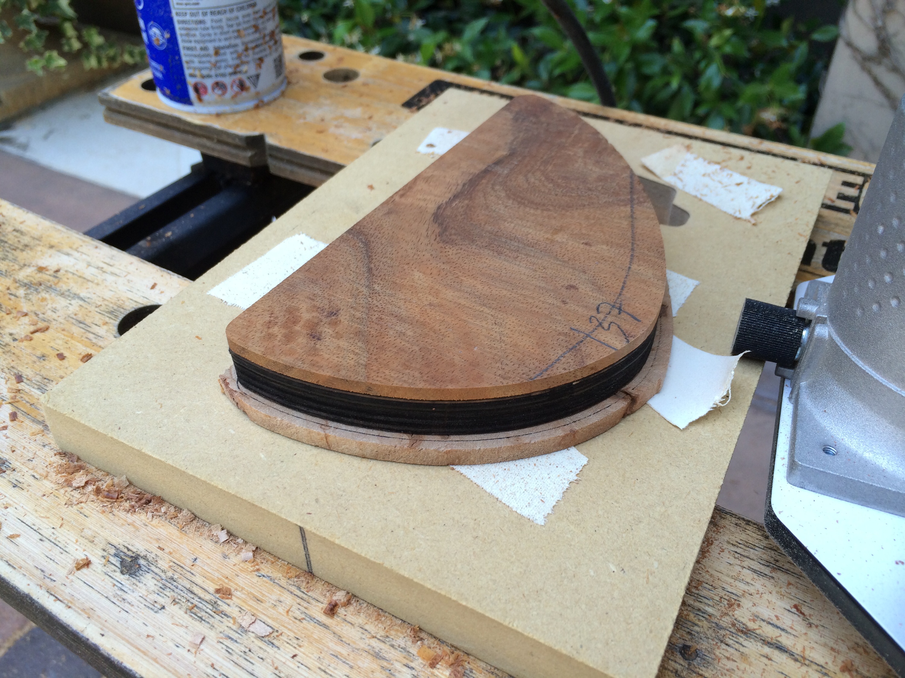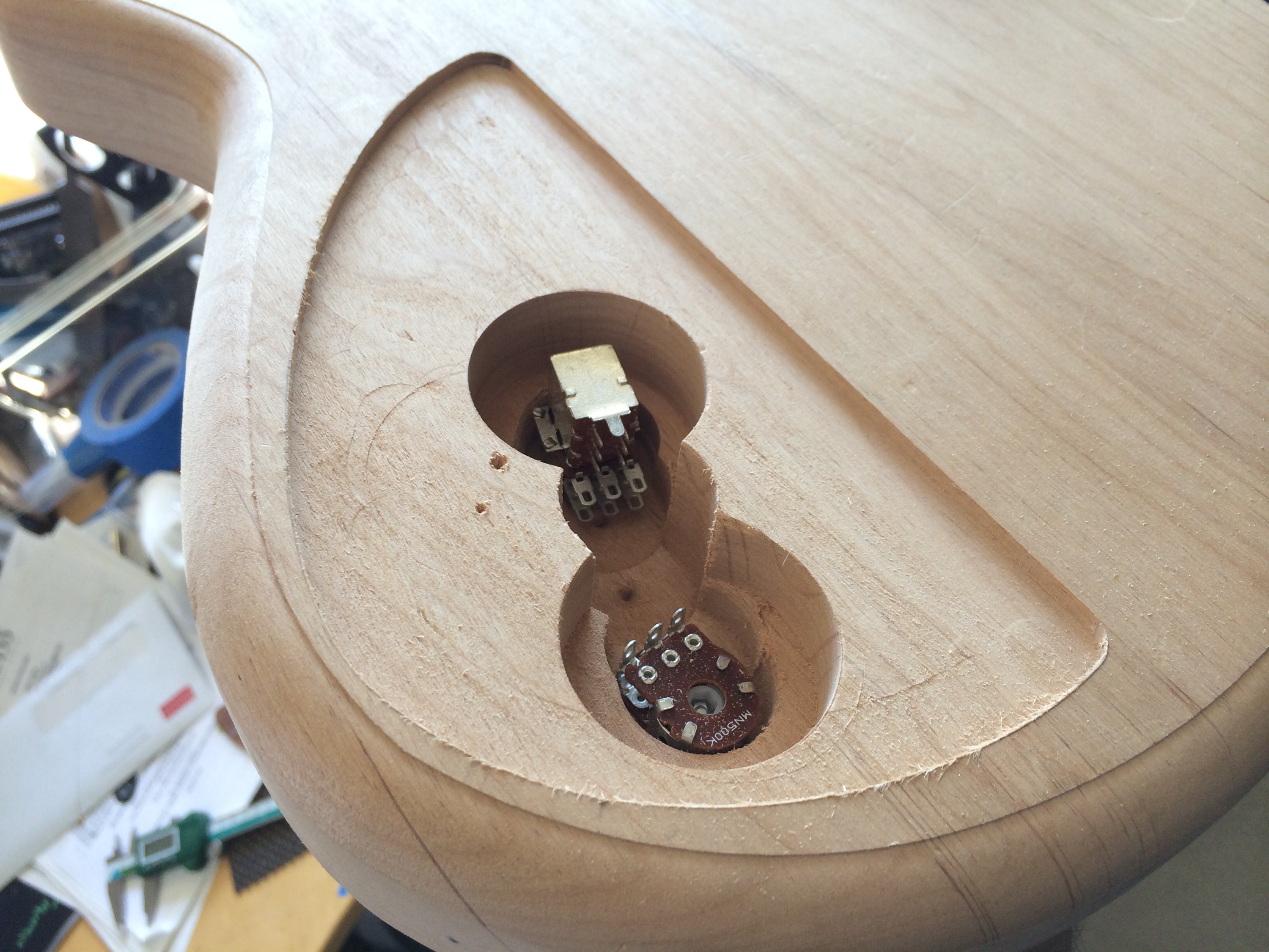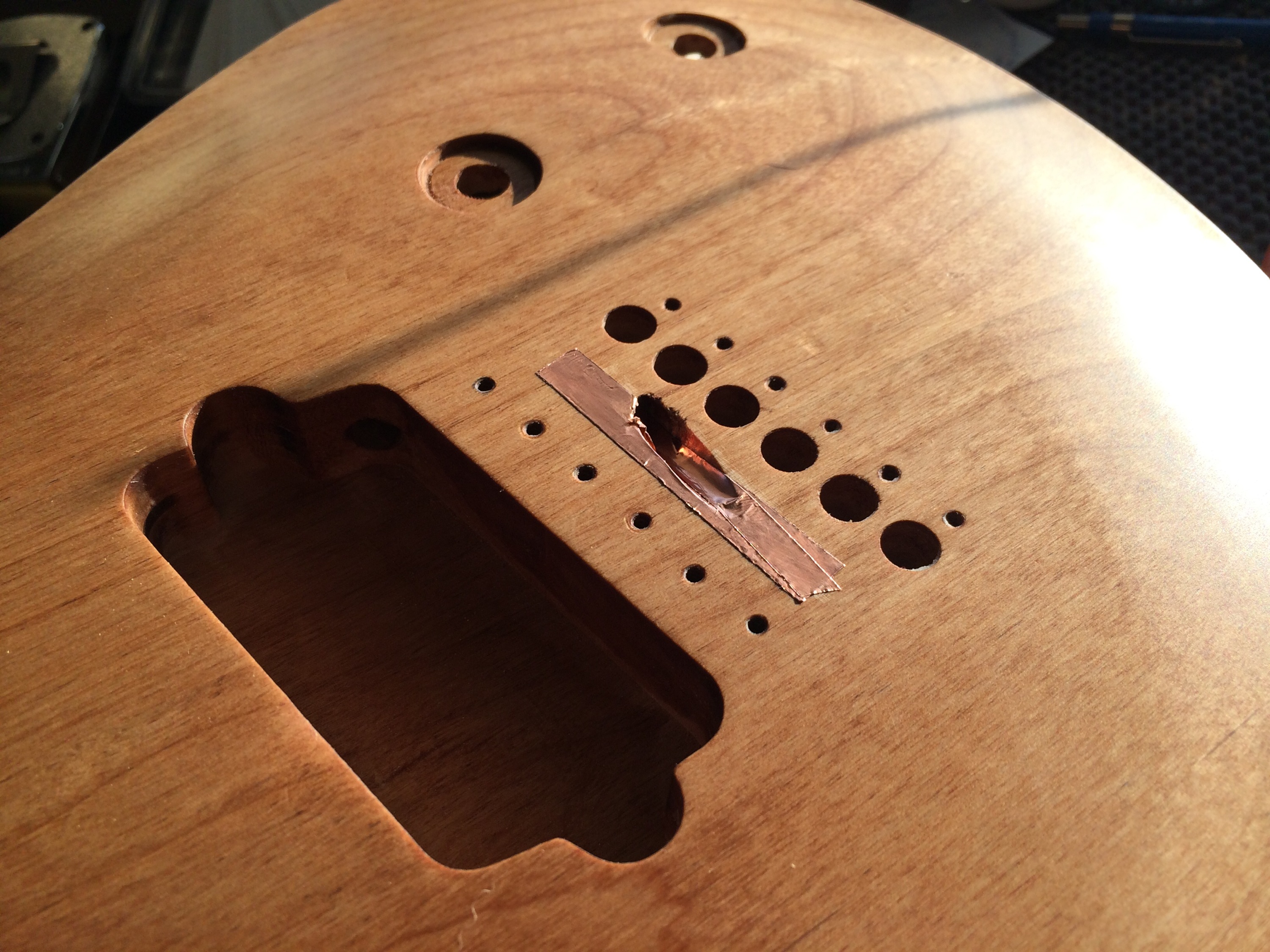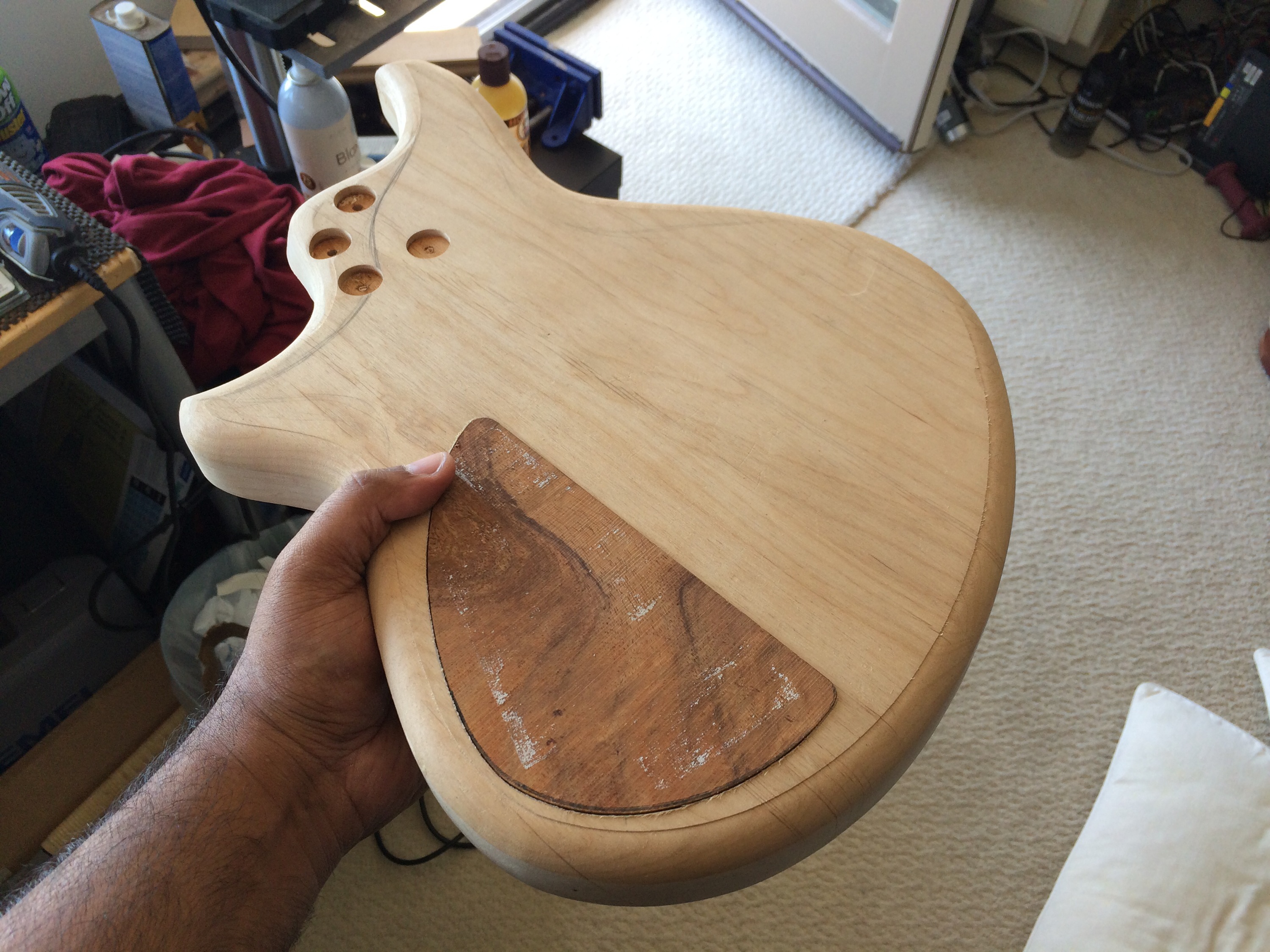 It’s all done! I left the back roughed up and then skipped grits to smooth out while preserving the rough look. The top is super smooth. I used Waterlox Original for my personal build because I wanted to see how it stood up to the hype. It’s a great finish but smells horrible. I used two coats sanding 220 and 320 then white scotch brite to smooth everything out. Then used Odies Hard Wax. It turned out much better than expected. Honestly I’ll be sticking to Odies in the future because it’s easy to work with and smells amazing while giving the same result. Now it’s off to Joel at Grants Guitars in Fountain Valley.