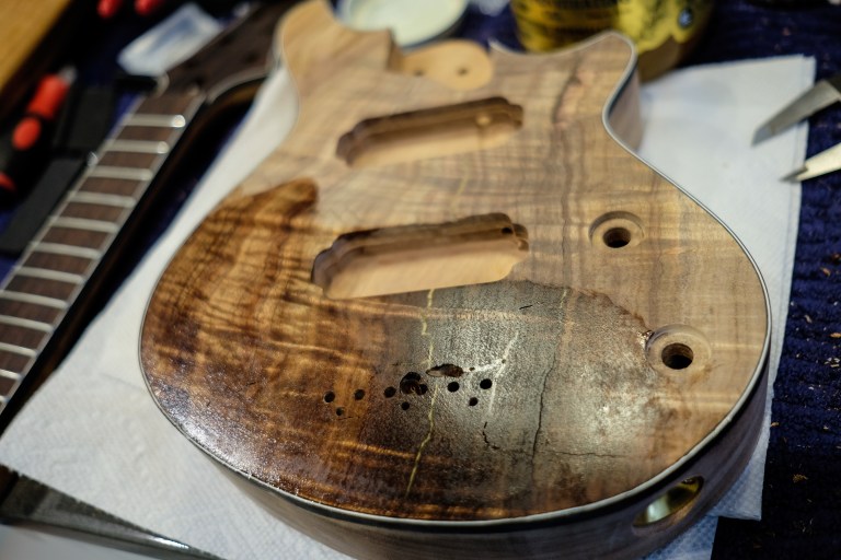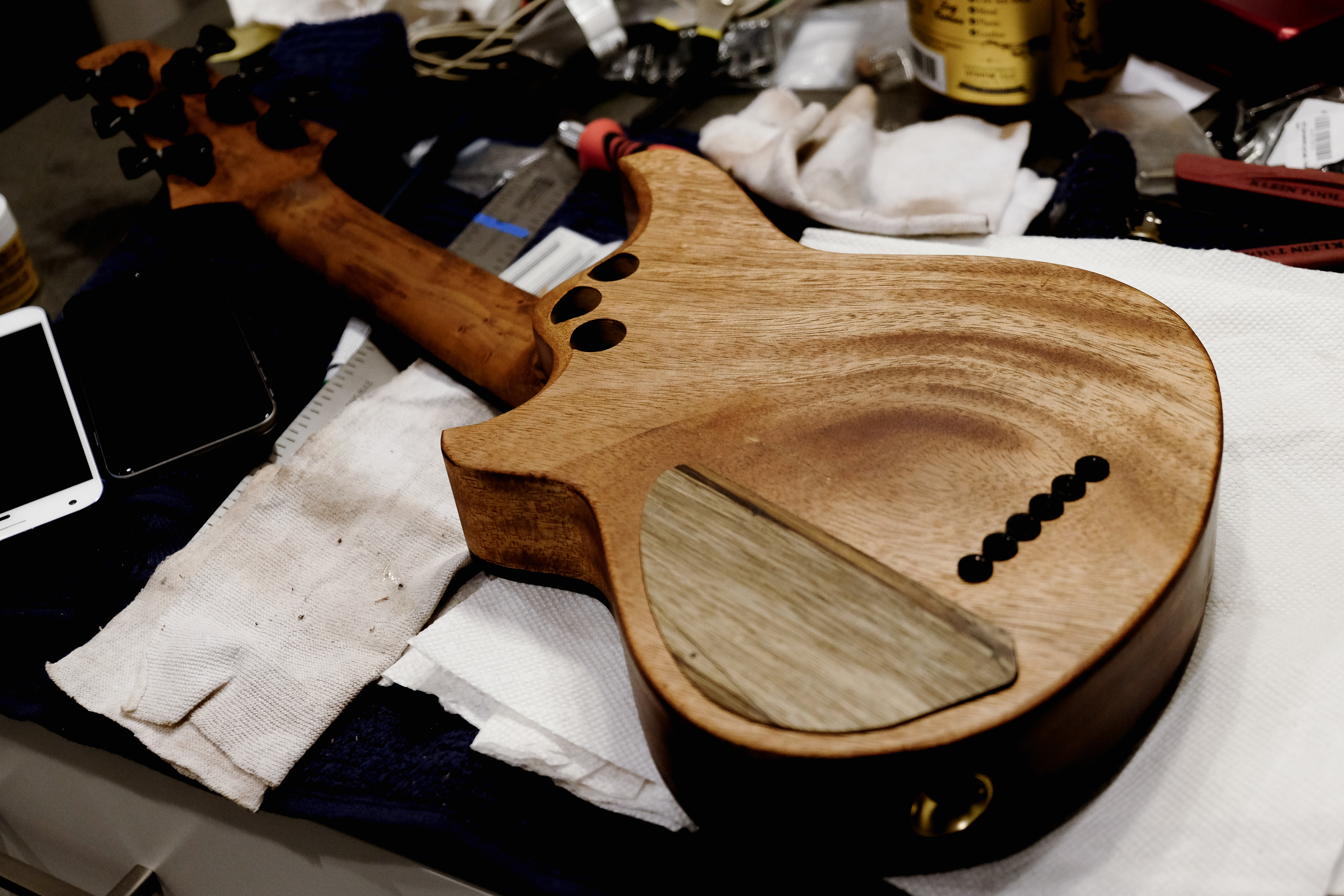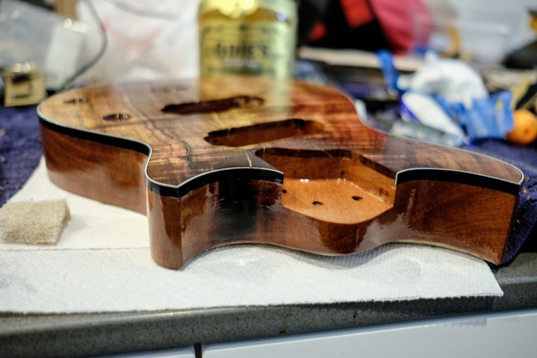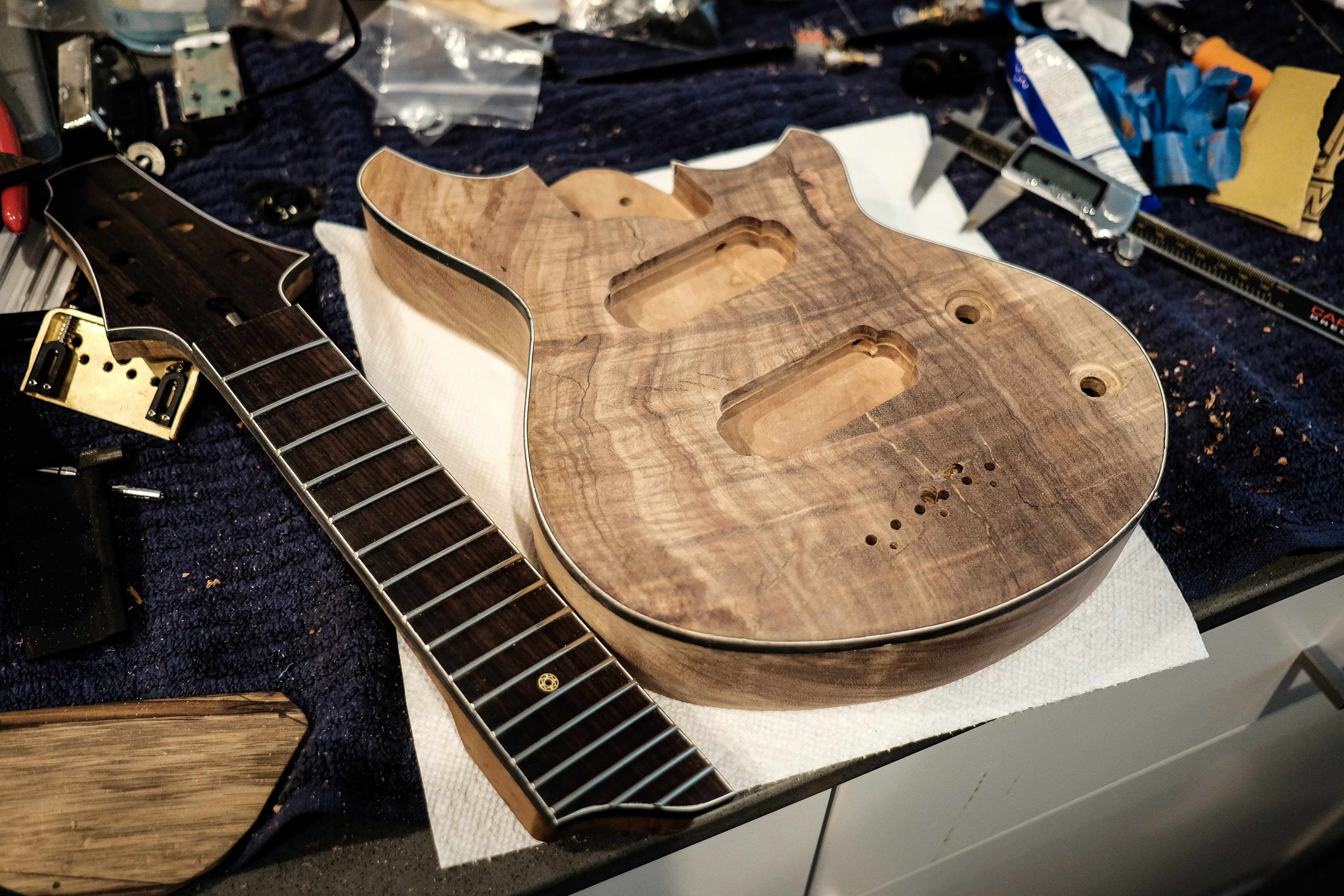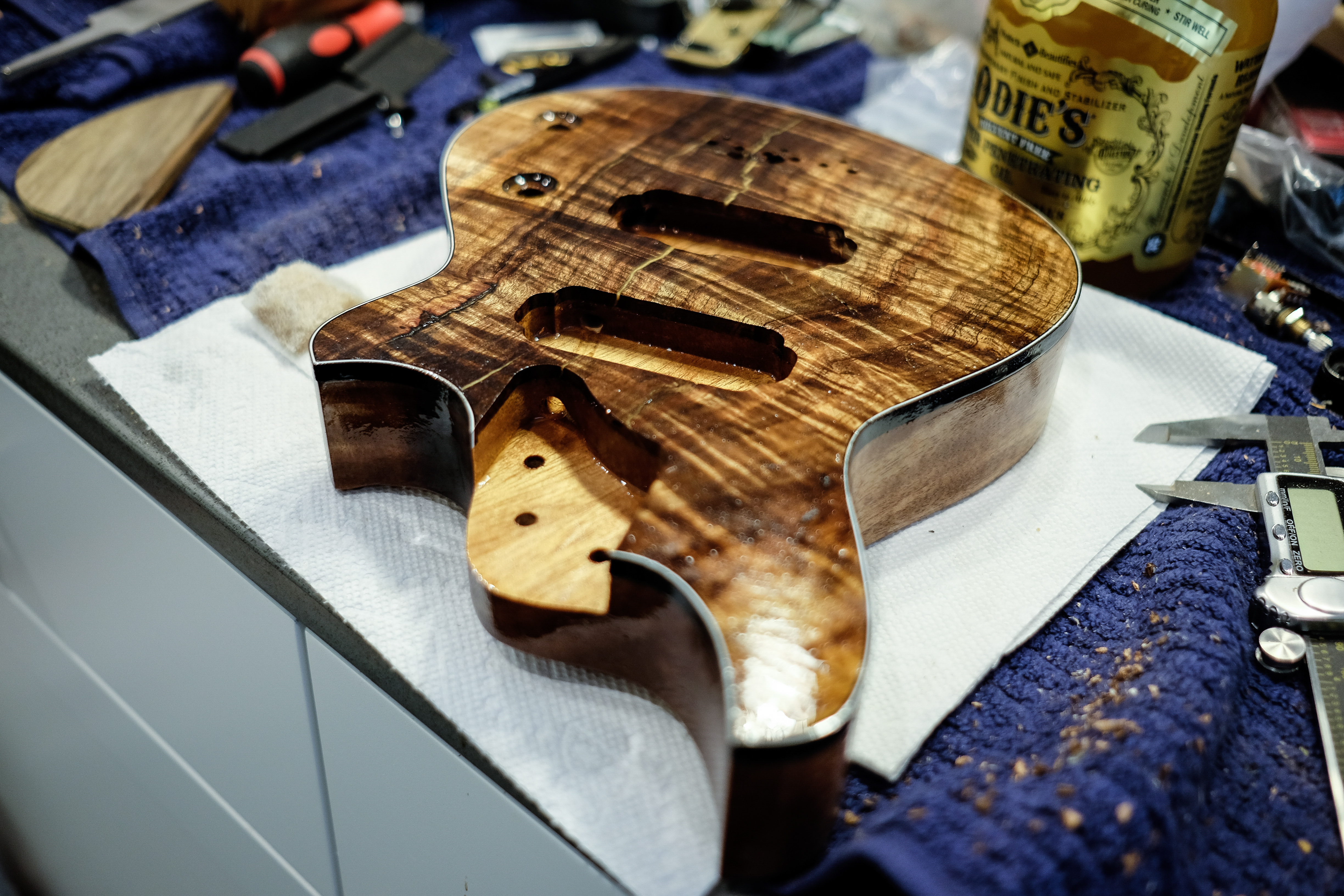 The results were much better than I’d hoped. Unfortunately I was a bit cocky and didnt try out this new BWB binding before this build. I should have sanded the sides to finish ready status before gluing the binding because I sanded through a bit in one or two areas. To add insult to injury my drill bit slipped while drilling the routing channels for the wires and I gouged a bit of the top near the bridge pickup cavity. I experienced instant humility. I will be keeping this model as a reminder to never rush and to always respect the process.