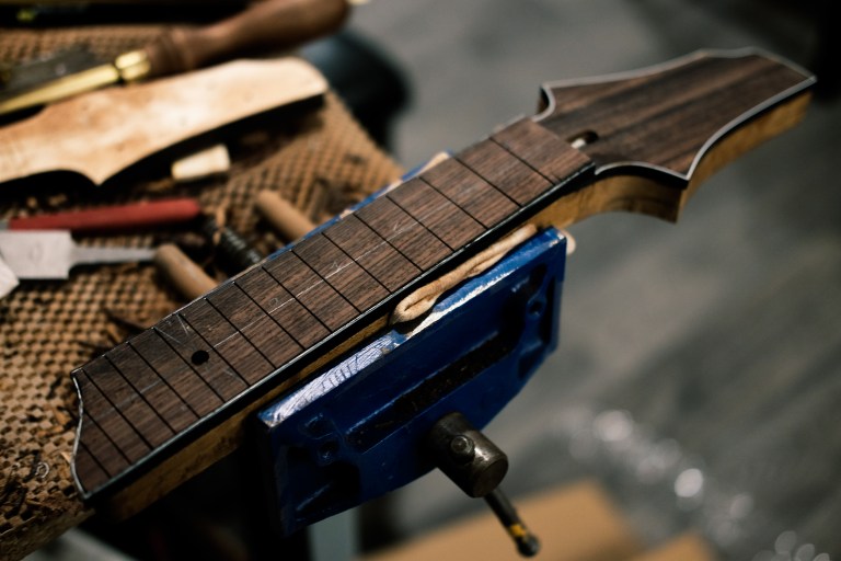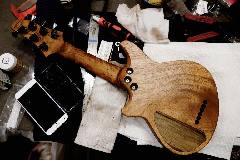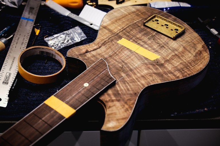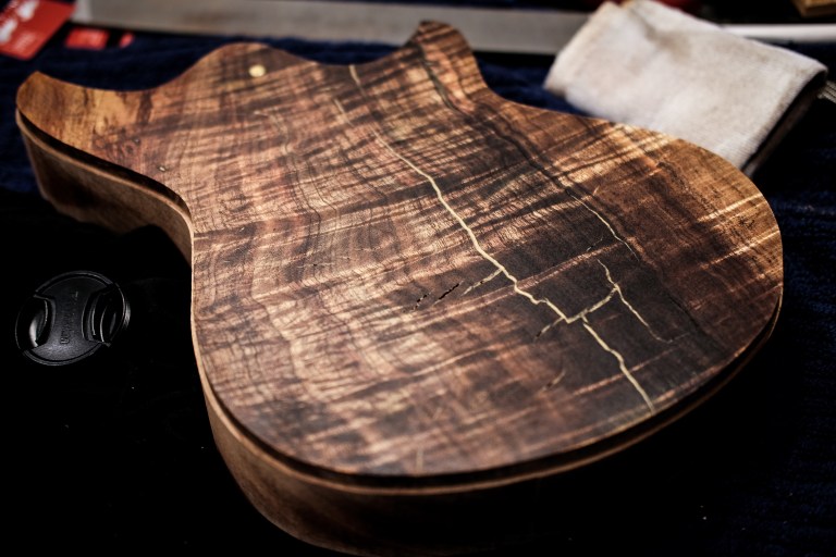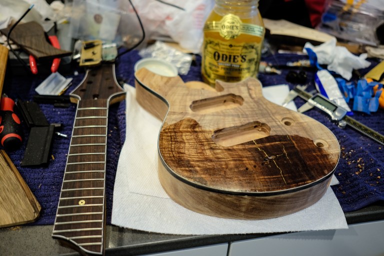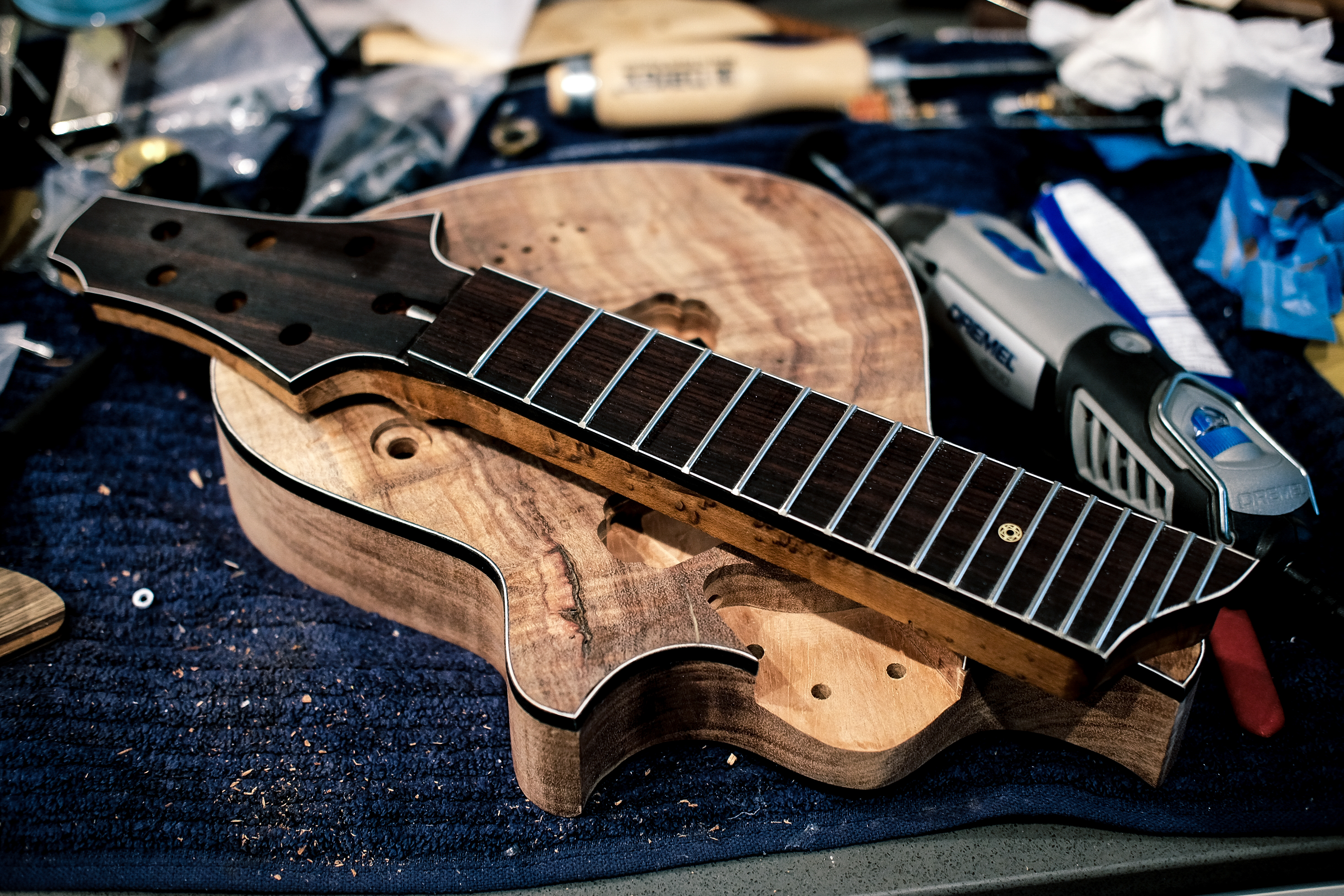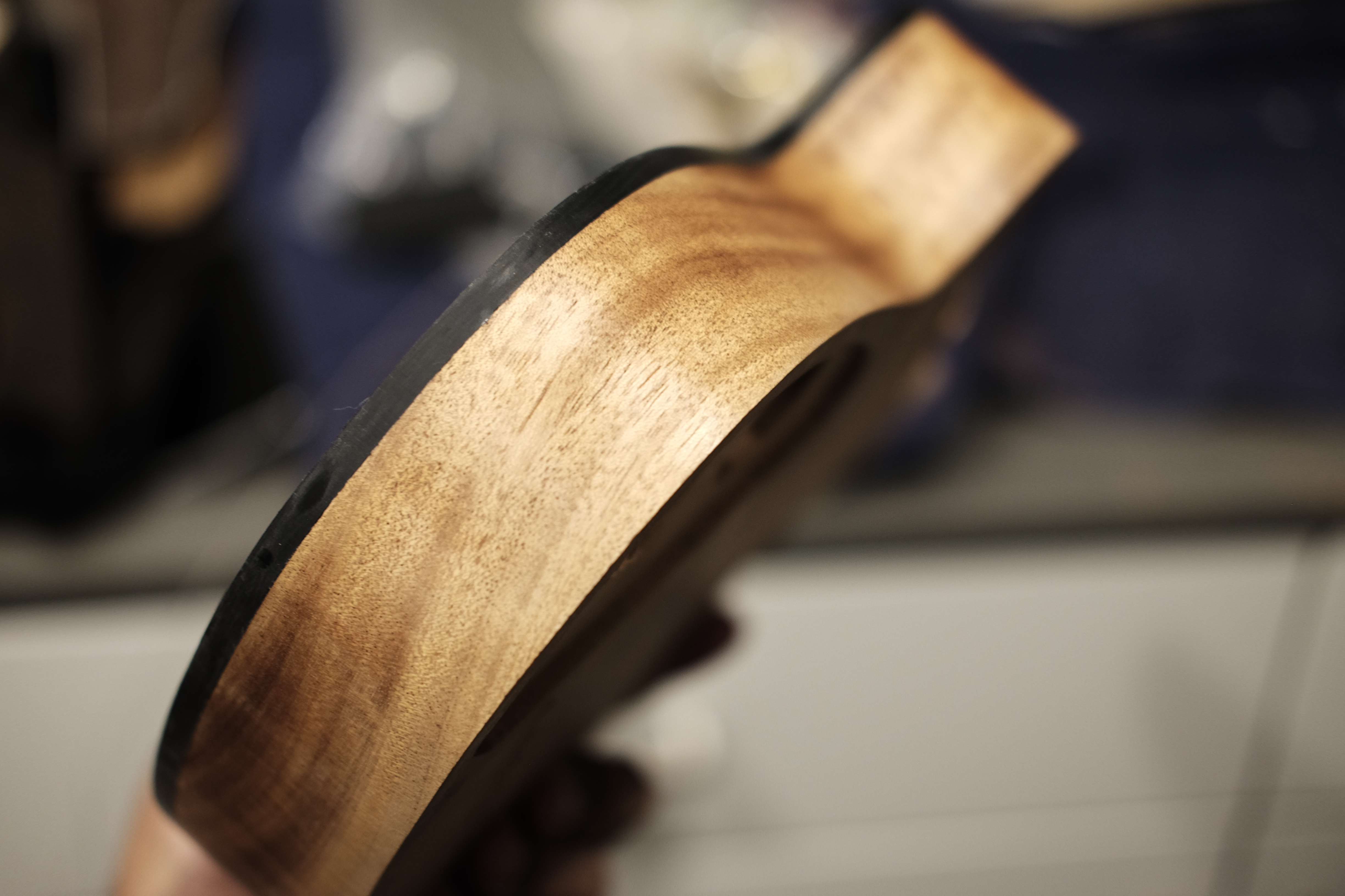 The results were much better than I’d hoped. Unfortunately I was a bit cocky and didnt try out this new BWB binding before this build. I should have sanded the sides to finish ready status before gluing the binding because I sanded through a bit in one or two areas. To add insult to injury my drill bit slipped while drilling the routing channels for the wires and I gouged a bit of the top near the bridge pickup cavity. I experienced instant humility. I will be keeping this model as a reminder to never rush and to always respect the process.