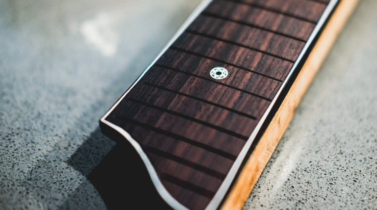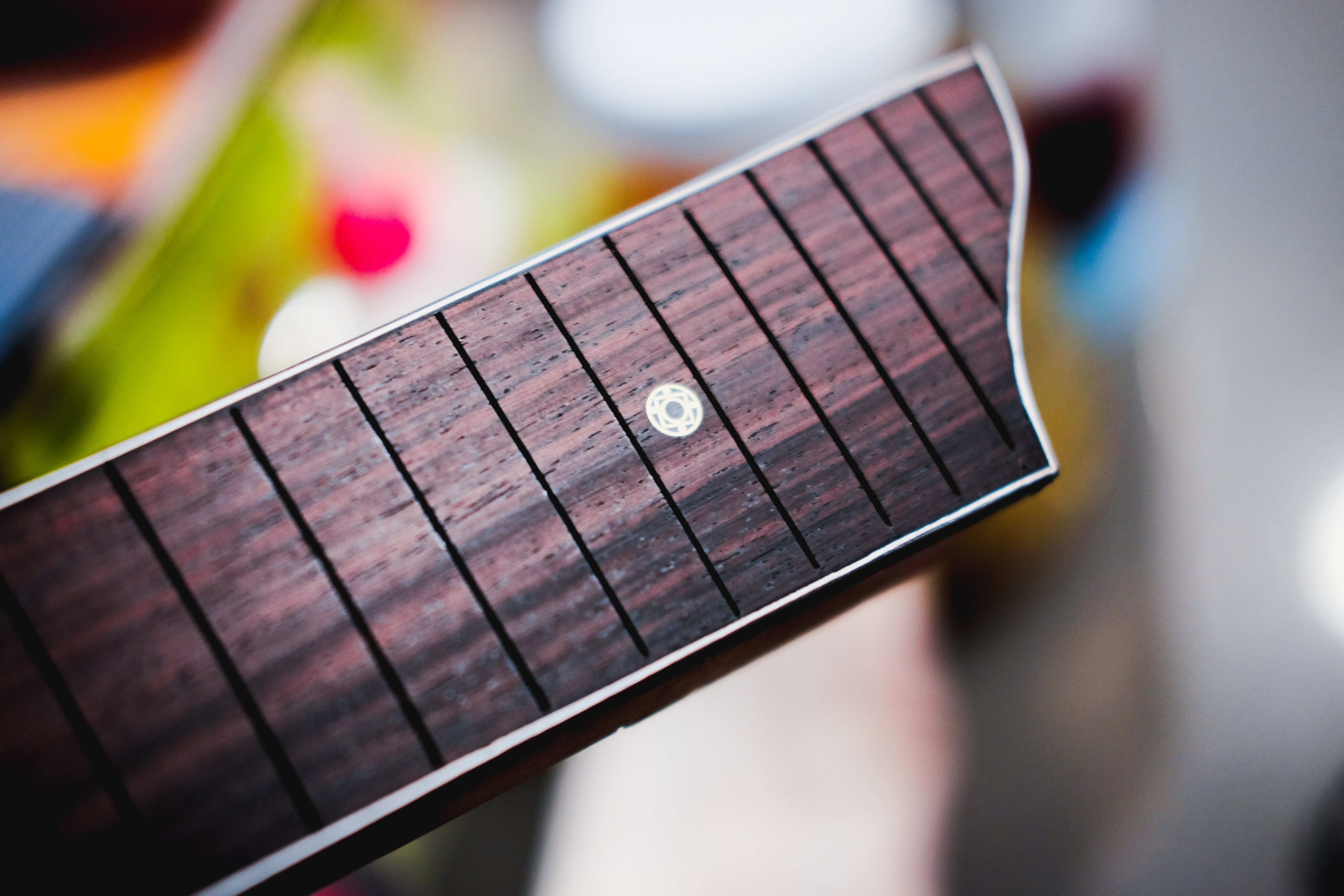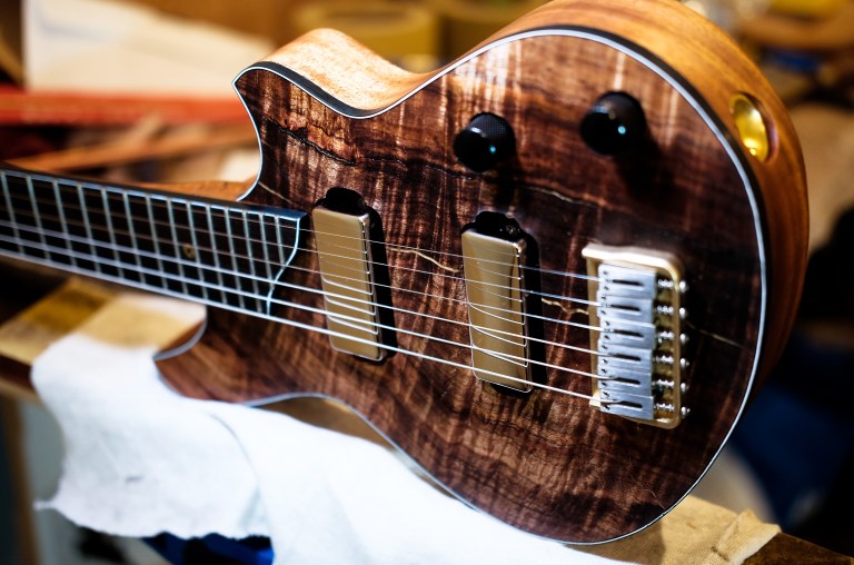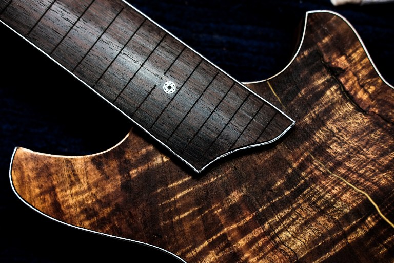 While studying my the last of my medical licensing exams I had an idea to make a miniature version of my guitars. Something I could just sit on the couch and strum on. This is basically the end result. I had a really nice piece of koa but it was only 13×10 in which isn’t enough for a full guitar top. So I sized down the body of one of my shapes to fit.