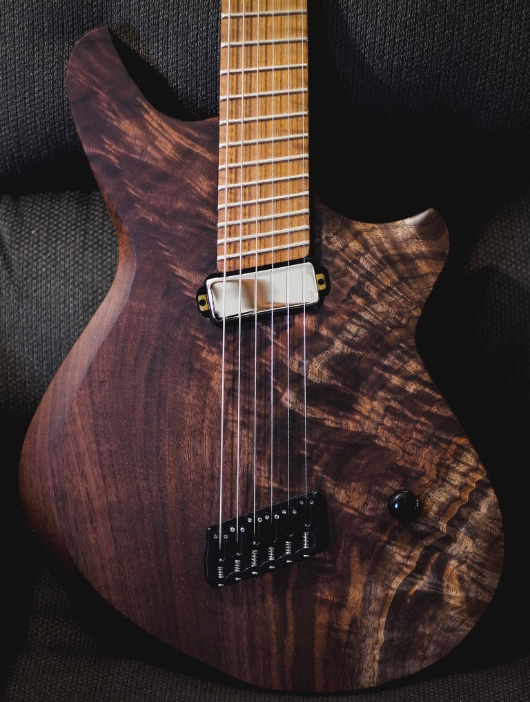Body: Claro Crotch Figure Walnut on One Piece African Mahogany