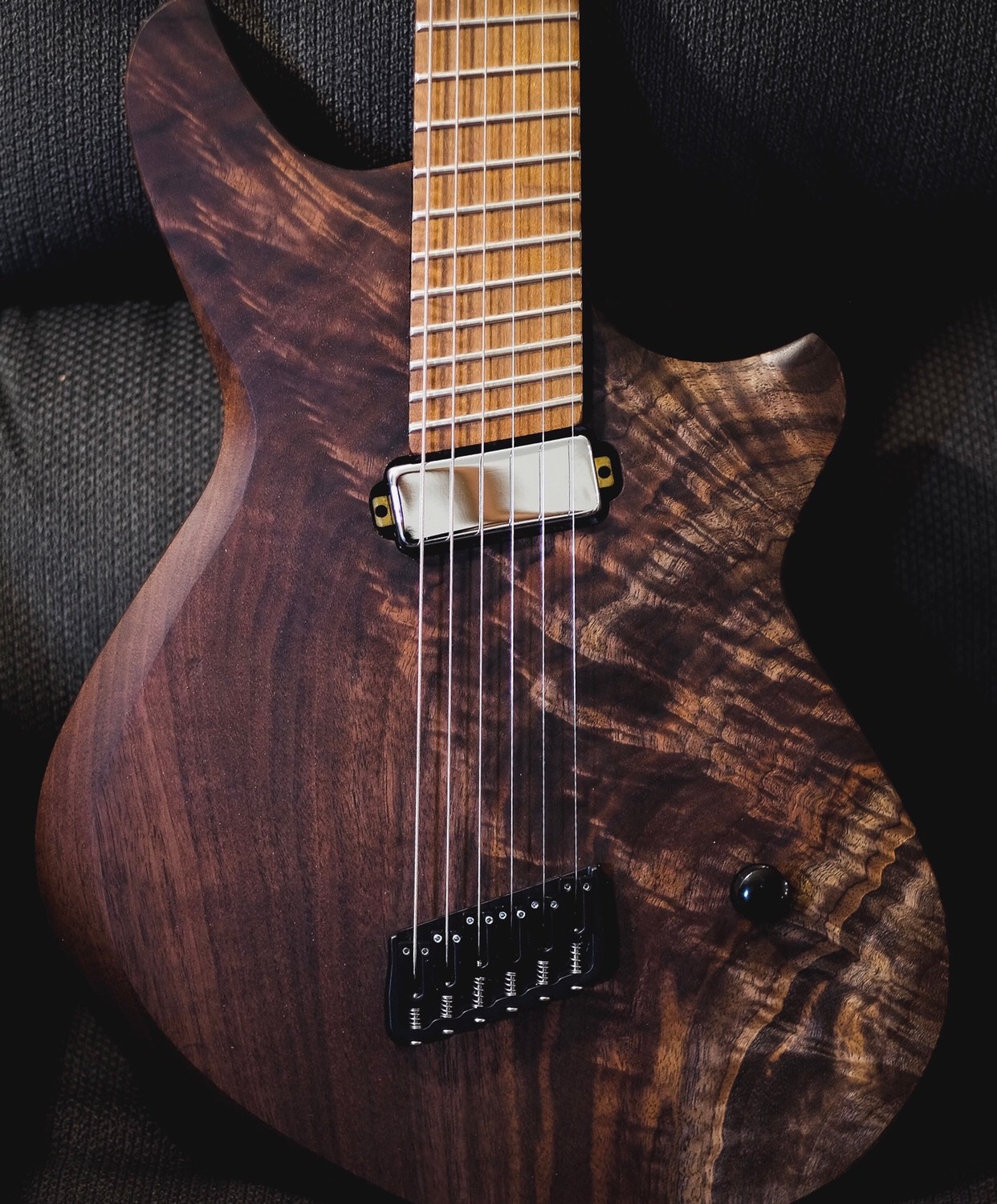 Body: Claro Crotch Figure Walnut on One Piece African Mahogany